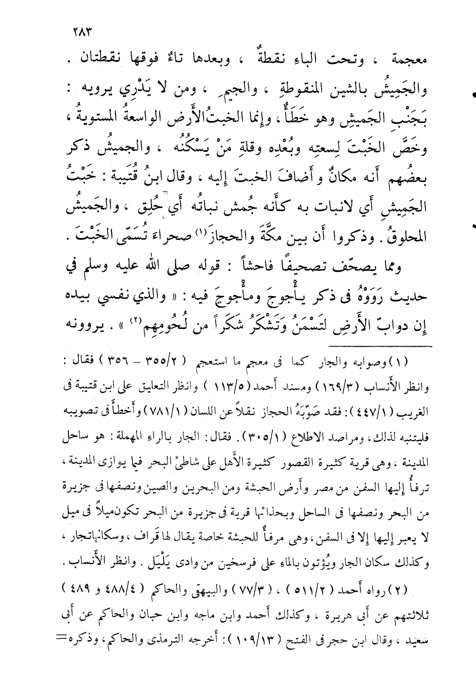 مُعْجمَة وَتَحْت الباءِ نقطةٌ وَبعدهَا تاءٌ فَوْقهَا نقطتان والجَمِيشُ بالشين المنقوطةِ وَالْجِيم وَمن لَا يَدْرِي يرويهِ بَجَنْبِ الجَمِيشِ وَهُوَ خَطَأٌ وَإِنَّمَا الخبتُ الأَرْض الواسعة المستويةُ وخَصَّ الخَبْتَ لِسعتِه وبُعْدِه وقلةِ مَنْ يَسْكُنُه والجميشْ ذكر بعضُهم أَنه مكانٌ وأَضافَ الخبتَ إِلَيْهِ وَقَالَ ابنُ قُتَيْبَة خَبْتَ الجَمِيشِ أَي لَا نَبَات بِهِ كأَنه جُمش نباتُه أَي حُلِق والجَميشُ المحلوقُ وَذكروا أَن بَين مكَّة والحجازَ صحراءَ تُسَمّى الخَبْتَ