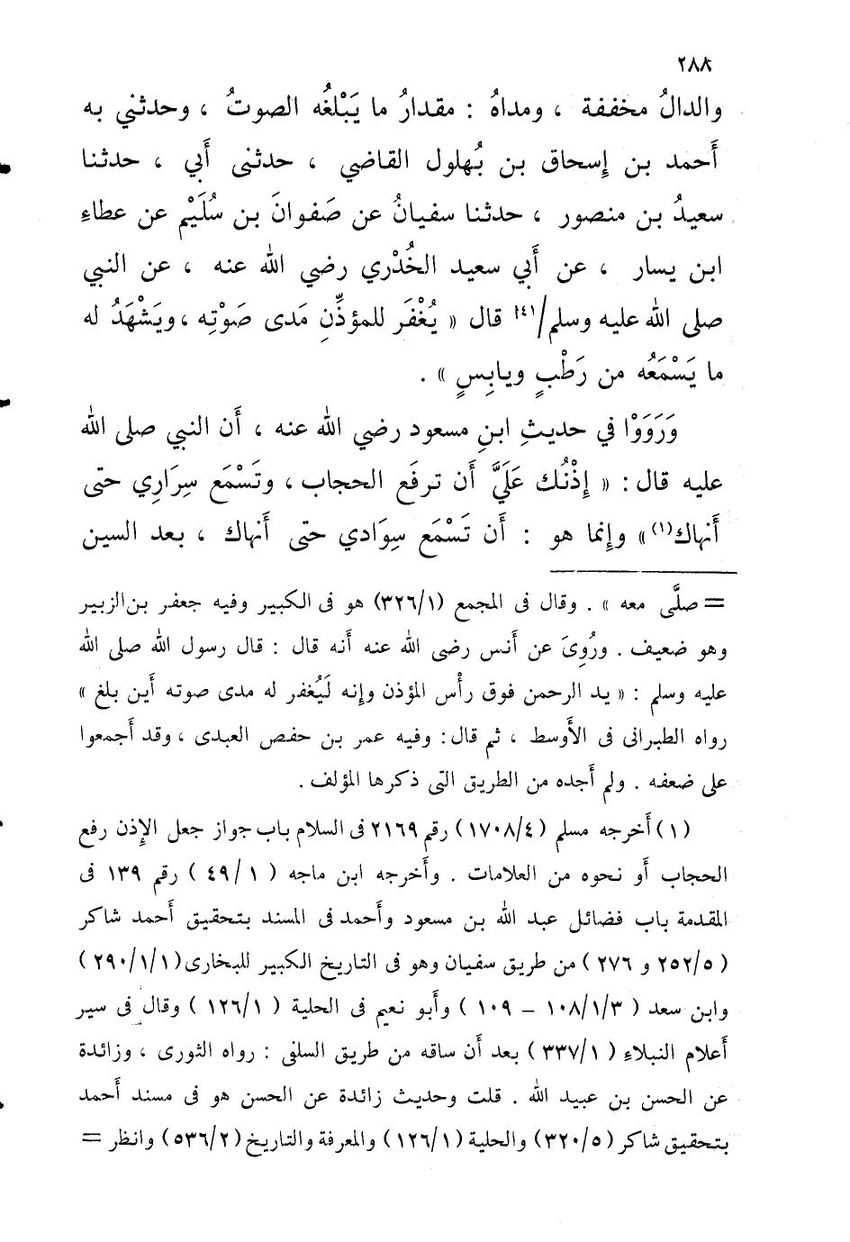 والدالُ مُخَفّفَة ومداهُ مقدارُ مَا يَبْلَغُه الصوتُ وَحَدَّثَنِي بِهِ أَحْمَدُ بْنُ إِسْحَاقَ بْنِ بُهْلُولٍ الْقَاضِي حَدَّثَنِي أَبِي حَدَّثَنَا سَعِيدُ بْنُ مَنْصُورٍ حَدَّثَنَا سُفْيَانُ عَنْ صَفْوَانِ بن سليم عَن عَطاء ابْن يَسَارٍ عَنْ أَبِي سَعِيدٍ الْخُدْرِيِّ رَضِيَ اللَّهُ عَنْهُ عَنِ النَّبِيِّ صلى الله عَلَيْهِ وَسلم 41 أقَالَ يُغْفَرُ لِلْمُؤَذِّنِ مَدَى صَوْتِهِ وَيَشْهَدُ لَهُ مَا يَسْمَعُهُ مِنْ رَطْبٍ وَيَابِسٍ