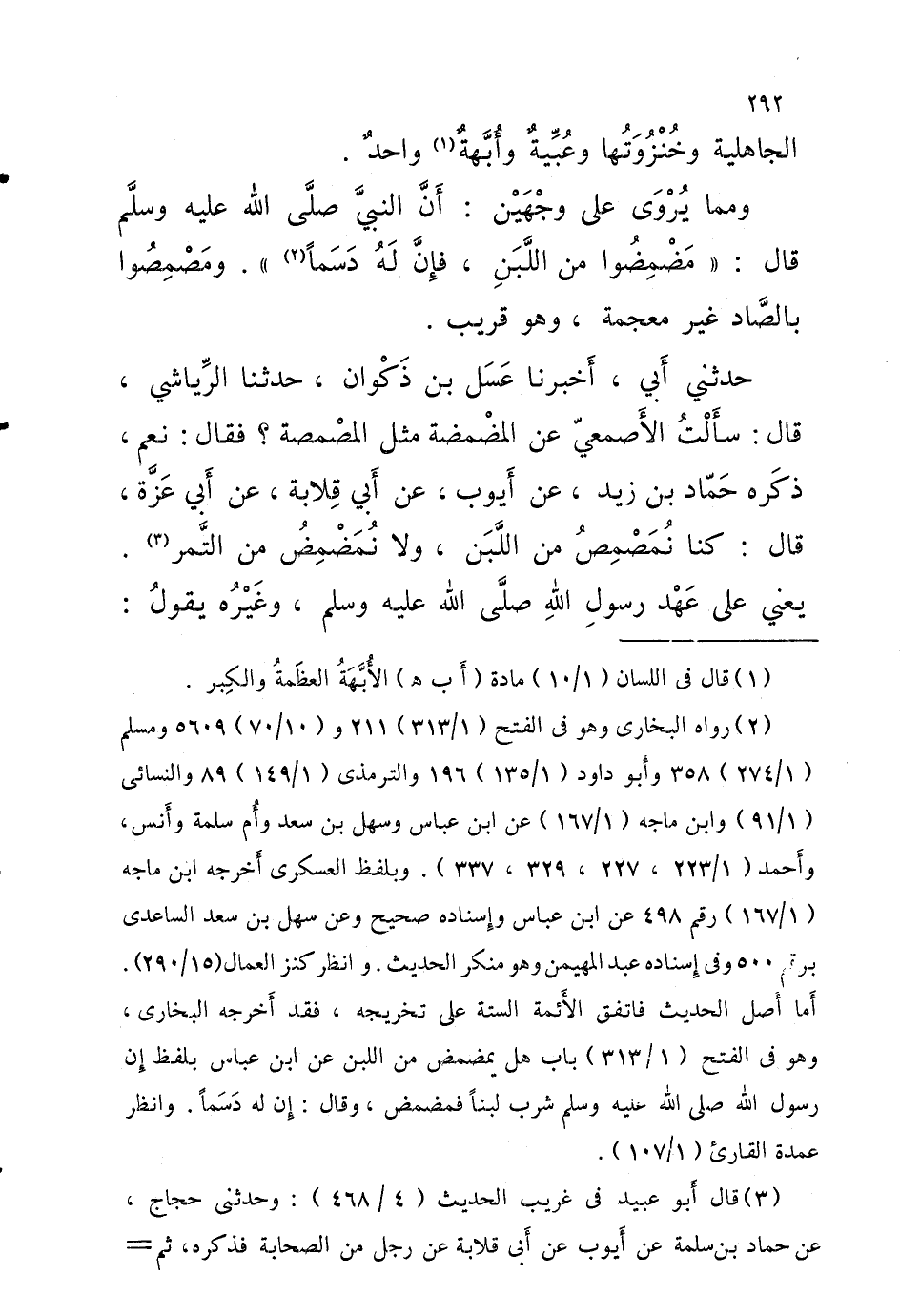 وَمِمَّا يُرْوَى عَلَى وجْهَيْن أَنَّ النَّبِيَّ صَلَّى اللَّهُ عَلَيْهِ وَسَلَّمَ قالَ مَضْمِضوا من اللَّبَنِ فإِنَّ لَهُ دَسَمًا ومَصْمِصُوا بالصَّاد غير مُعْجمَة وَهُوَ قريب