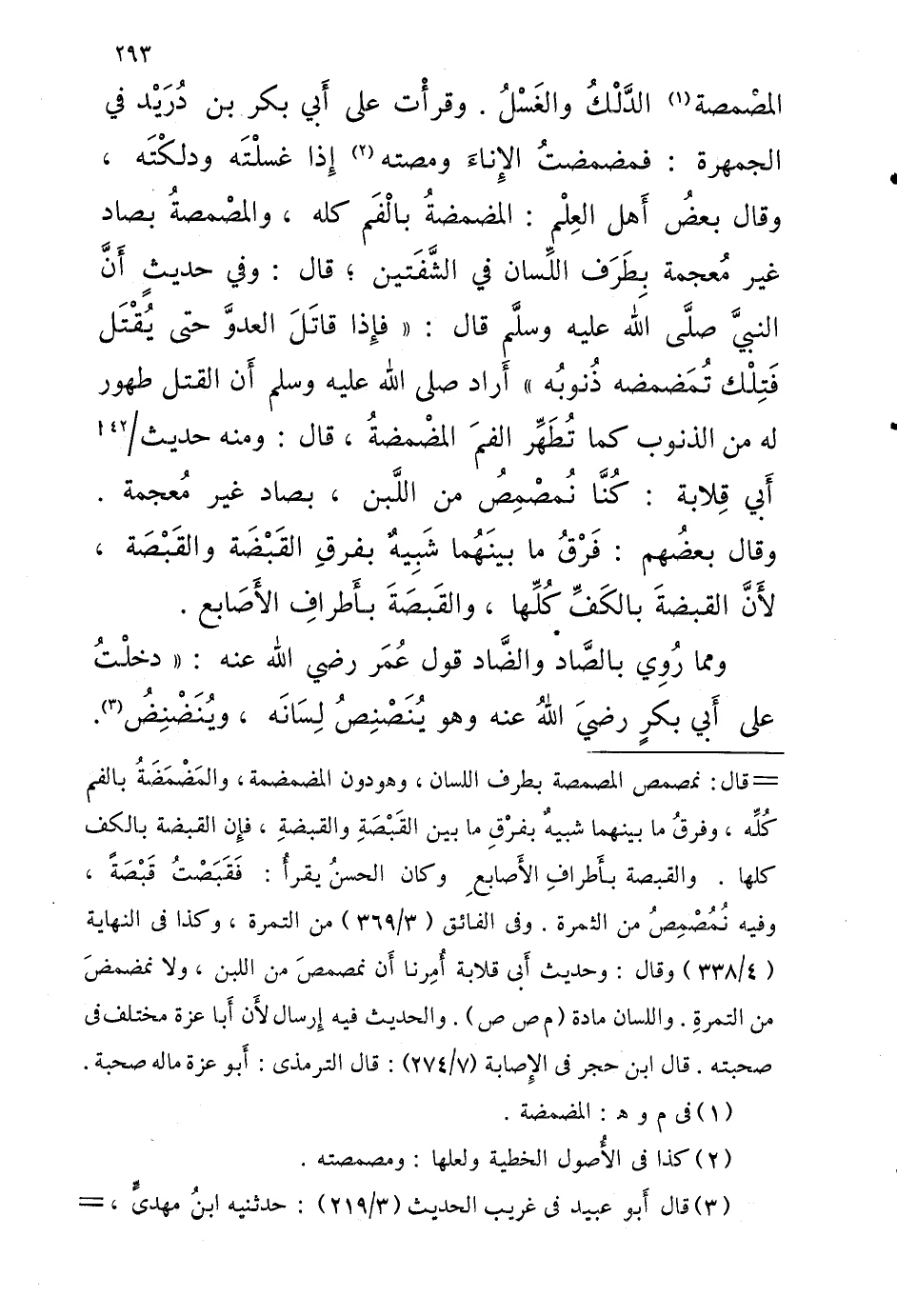 وَمِمَّا رُوي بالصَّاد والضَّاد قَول عُمَر رَضِيَ اللَّه عَنْهُ دخلت عَلَى أَبِي بكر رَضِي الله عَنهُ وَهُوَ يُنَصْنِصُ لِسَانه ويُنَضْنِضُ