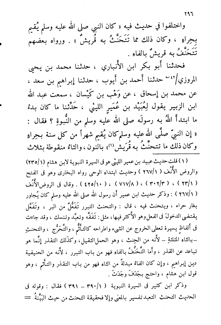 فَحَدَّثَنَا أَبُو بكر ابْنُ الأَنْبَارِيُّ حَدَّثَنَا مُحَمَّدُ بْنُ يحيى الْمروزِي 42 ب حَدَّثَنَا أَحْمَدُ بْنُ أَيُّوبَ حَدَّثَنَا إِبْرَاهِيمُ بْنُ سَعْدٍ عَنْ مُحَمَّدِ بْنِ إِسْحَاقَ عَنْ وَهْبِ بْنِ كيسَان عبد الله ابْن الزُّبَيْرِ يَقُولُ لِعُبَيْدِ بْنِ عُمَيْرٍ الليثني حُدِّثَنَا مَا كَانَ بَدْءُ مَا ابْتَدَأَ اللَّهُ بِهِ رَسُولَهُ صَلَّى اللَّهُ عَلَيْهِ وَسَلَّمَ مِنَ النُّبُوَّةِ فَقَالَ إِنَّ النَّبِيَّ صَلَّى اللَّهُ عَلَيْهِ وَسَلَّمَ كَانَ يُقِيمُ شَهْرًا مِنْ كُلِّ سَنَةٍ بِحِرَاءٍ وَكَانَ ذَلِكَ مَا تَتَحَنَّثُ بِهِ قُرَيْشٌ بالنُّون والثاءُ منقوطة بِثَلَاث