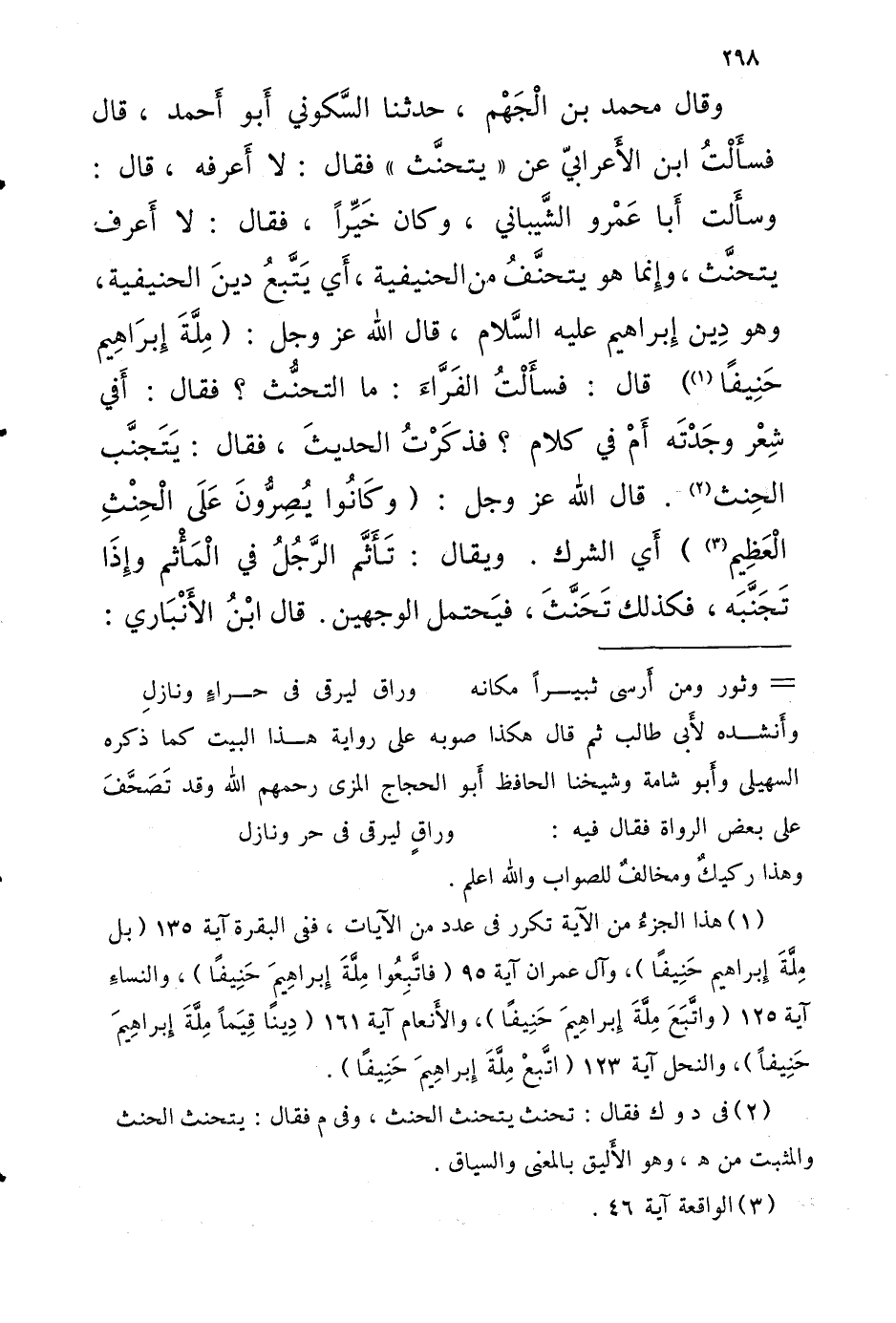 وَقَالَ مُحَمَّد بْن الْجَهْم حَدَّثَنَا السكونِي أَبُو أَحْمَد قالَ فسأَلتُ ابْن الأَعرابي عَن يتحنَّث فَقَالَ لَا أَعرفه قالَ وسأَلت أَبا عَمْرو الشَّيْبَانِيّ وَكَانَ خَيِّرًا فَقَالَ لَا أَعرف يتحنَّث وإِنما هُوَ يتحنَّفُ من الحنيفية أَي يَتَّبعُ دينَ الحنيفية وَهُوَ دينِ إِبْرَاهِيم عَلَيْهِ السَّلَام قالَ اللَّه عز وَجل (مِلَّة ابراهيم حَنِيفا) قالَ فسأَلْتُ الفَرَّاءَ مَا التحنُّث فَقَالَ أَفي شِعْرٍ وجَدْتَه أَمْ فِي كَلَام فذكرتُ الحَدِيث فَقَالَ يَتَجنَّب الحِنث قالَ اللَّه عز وَجل (وَكَانُوا يُصِرُّونَ عَلَى الْحِنْثِ الْعَظِيم) أَي الشّرك وَيُقَال تَأَثَّم الرَّجُلُ فِي الْمَأْثم وإِذا تَجَنَّبَه فَكَذَلِك تَحَنَّثَ فَيحْتَمل الْوَجْهَيْنِ قالَ ابْن الأَنْبَاري