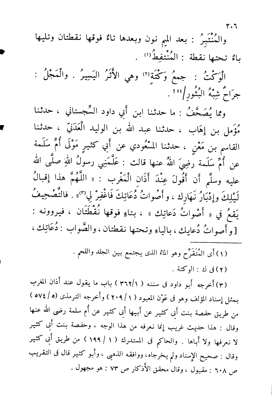 وَمِمَّا يُصَحَّفُ مَا حَدَّثَنَا ابْنُ أَبِي دَاوُدَ السِّجِسْتَانِيُّ حَدَّثَنَا مُؤَمَّلُ بْنُ إِهَابٍ حَدَّثَنَا عَبْدُ اللَّهِ بْنُ الْوَلِيدِ الْعَدَنِيُّ حَدَّثَنَا الْقَاسِمُ بْنُ مَعْنٍ حَدَّثَنَا الْمَسْعُودِيُّ عَنْ أَبِي كَثِيرٍ مَوْلَى أُمِّ سَلَمَةَ عَنْ أُمِّ سَلَمَةَ رَضِيَ اللَّهُ عَنْهَا قَالَتْ عَلَّمَنِي رَسُولُ اللَّهِ صَلَّى اللَّهُ عَلَيْهِ وَسَلَّمَ إِنَّ أَقُولَ عِنْدَ أَذَانِ الْمَغْرِبِ اللَّهُمَّ هَذَا إِقْبَالُ لَيْلِكَ وَإِدْبَارُ نَهَارِكَ وأصوات دعاتك فاعفر لِي فالتصحيف يَقع فِي أصوات دعاتك بتاءٍ فَوْقهَا نقطتان فيروونه [وأصواتُ دُعايك بالياءِ وتحتها نقطتان وَالصَّوَاب دُعاتِك