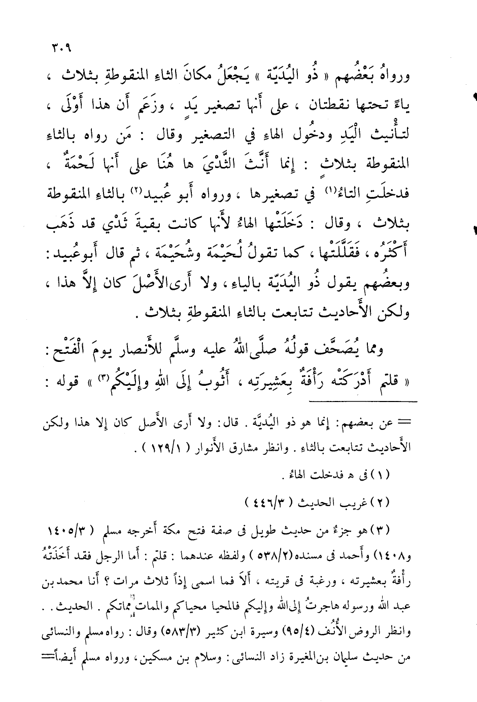 ورواهُ بَعضهم ذُو اليُدَيّة يَجْعَل مَكَان الثاءِ المنقوطة بِثَلَاث يَاء تحتهَا نقطتان عَلَى أَنَّهَا تَصْغِير يدٍ وَزعم أَن هَذَا أولى لتأنيث الْيَد وَدخُول الهاءِ فِي التصغير وَقَالَ من رَواه بالثاءِ المنقوطة بِثَلَاث انما أنث الثَّدْيَ هَا هُنَا عَلَى أَنها لحْمَة فَدخلت التاءُ فِي تصغيرها وَرَوَاهُ أَبُو عبيد بالثاء المنقوطة بِثَلَاث وَقَالَ دَخَلَتْها الهاءُ لأَنها كَانَتْ بَقِيَّة ثَدْي قد ذَهَب أَكْثَرُه فَقَلَّلَتْها كَمَا تقولُ لُحَيْمَة وشُحَيْمَة ثُمّ قالَ أَبُو عُبَيْد وبعضُهم يَقُول ذُو اليُدَيّة بالياءِ وَلَا أَرى الأَصْل كَانَ إِلَّا هَذَا وَلَكِن الأَحاديث تَتَابَعَت بالثاءِ المنقوطةِ بِثَلَاث