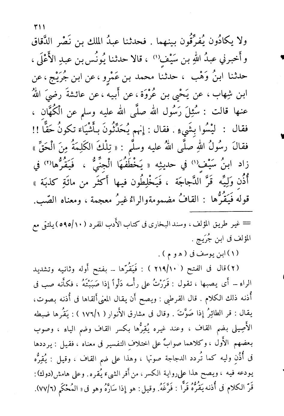 وَلَا يكادُون يُفرِّقُون بَينهمَا فَحَدَّثَنَا عَبْدُ الْمَلِكِ بْنُ نَصْرٍ الدَّقَّاقُ وَأَخْبَرَنِي عَبْدُ اللَّهِ بْنُ سَيْفٍ قَالا حَدَّثَنَا يُونُسُ بْنُ عَبْدِ الأَعْلَى حَدَّثَنَا ابْنُ وَهْبٍ حَدَّثَنَا مُحَمَّدُ بْنُ عَمْرٍو عَنِ ابْنِ جُرَيْجٍ عَنِ ابْنِ شِهَابٍ عَنْ يَحْيَى بْنِ عُرْوَةَ عَنْ أَبِيهِ عَنْ عَائِشَةَ رَضِيَ اللَّهُ عَنْهَا قَالَتْ سُئِلَ رَسُولُ اللَّهِ صَلَّى اللَّهُ عَلَيْهِ وَسَلَّمَ عَنِ الْكُهَّانِ فَقَالَ لَيْسُوا بِشَيْءٍ فَقَالَ إِنَّهُمْ يُحَدِّثُونَ بِأَشْيَاءَ تَكُونُ حَقًّا فَقَالَ رَسُولِ اللَّهِ صَلَّى اللَّهُ عَلَيْهِ وَسَلَّمَ تِلْكَ الْكَلِمَةُ مِنَ الْحَقِّ زَادَ ابْنُ سَيْفٍ فِي حَدِيثِهِ يَخْطَفُهَا الْجِنِّيُّ فَيَقُرُّهَا فِي أُذُنِ وَلِيِّهِ قَرَّ الدَّجَاجَةِ فَيَخْلِطُونَ فِيهَا أَكْثَرَ مِنْ مِائَةٍ كَذْبَةٍ قَوْله فيقرها القافُ مَضْمُومَة والراءُ غيرُ مُعْجمَة وَمَعْنَاهُ الصّب