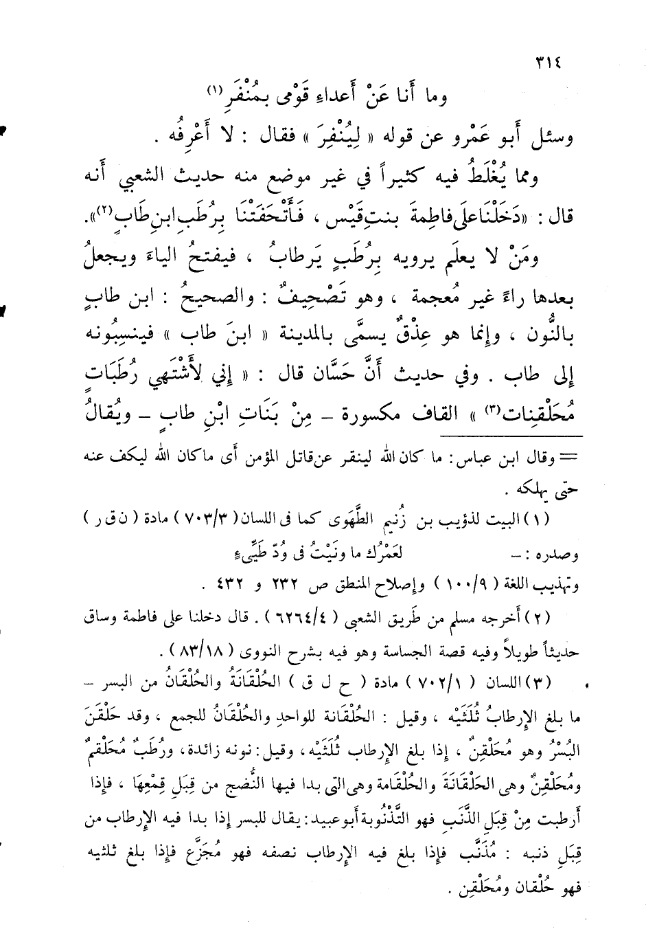 وَمِمَّا يُغْلَطُ فِيهِ كثيرا فِي غير مَوضِع مِنْهُ حَدِيث الشَّعْبِيّ أنَّه قالَ دَخَلنَا عَلَى فَاطِمَة بِنْت قَيْس فَأَتْحَفَتْنَا بِرُطَبِ ابنِ طَابٍ
