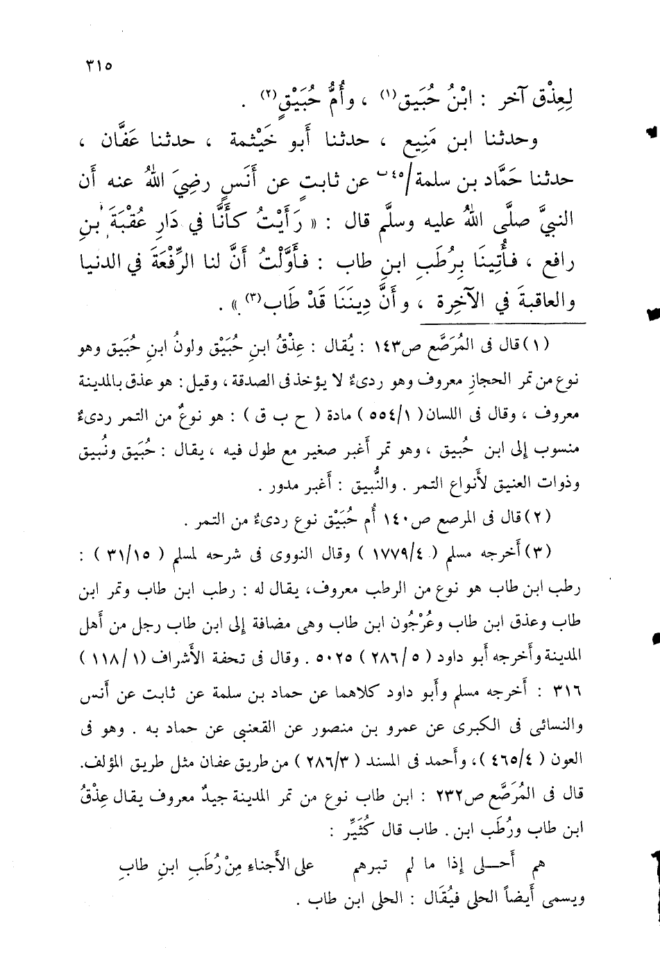 وَحَدَّثَنَا ابْنُ مَنِيعٍ حَدَّثَنَا أَبُو خَيْثَمَةَ حَدَّثَنَا عَفَّانُ حَدَّثَنَا حَمَّاد بن سَلمَة 45 ب عَنْ ثَابِتٍ عَنْ أَنَسٍ رَضِيَ اللَّه عَنْهُ أَن النَّبِيّ صلى اللَّهُ عَلَيْهِ وَسَلَّمَ قَالَ رأَيْتُ كأَنَّا فِي دَارِ عُقْبَةَ بْنِ رَافع فأتينا برطب ابْنَ طَابٍ فَأَوَّلْتُ أَنَّ لَنَا الرِّفْعَةَ فِي الدُّنْيَا وَالْعَاقِبَةَ فِي الآخِرَةِ وَأَنَّ ديِنَنَا قَدْ طَابَ