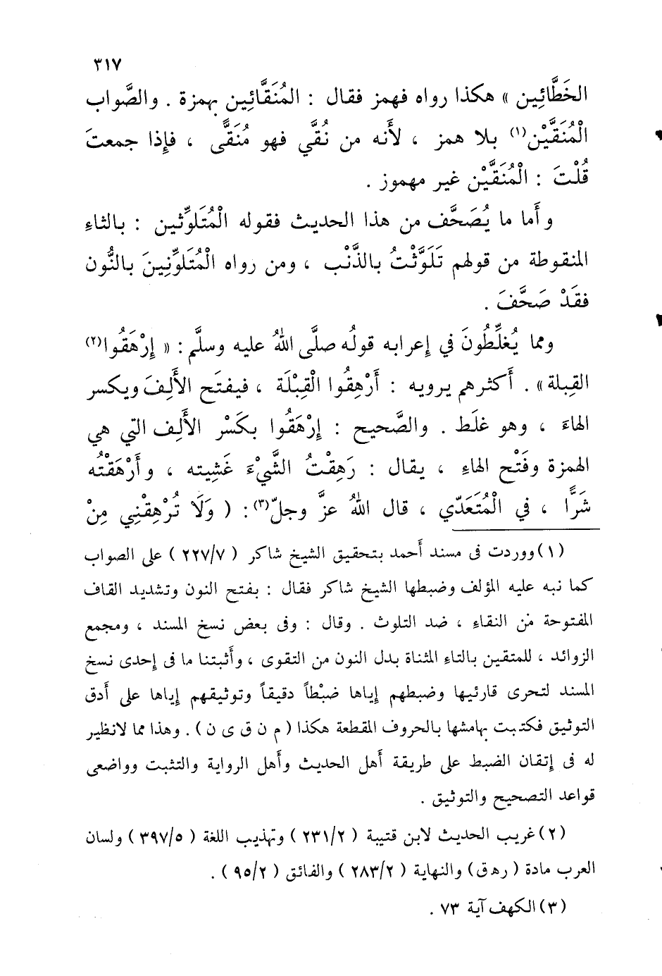 الْخَطَّائِينَ هَكَذَا رَوَاه فهمز فَقَالَ المنَقَّائِين بِهَمْزَة وَالصَّوَاب الْمُنَقَّيْن بِلَا همز لأنَه من نُقّي فَهُوَ مُنَقًّى فَإِذا جمعتَ قُلْتَ الْمُنَقَّيْن غير مَهْمُوز
