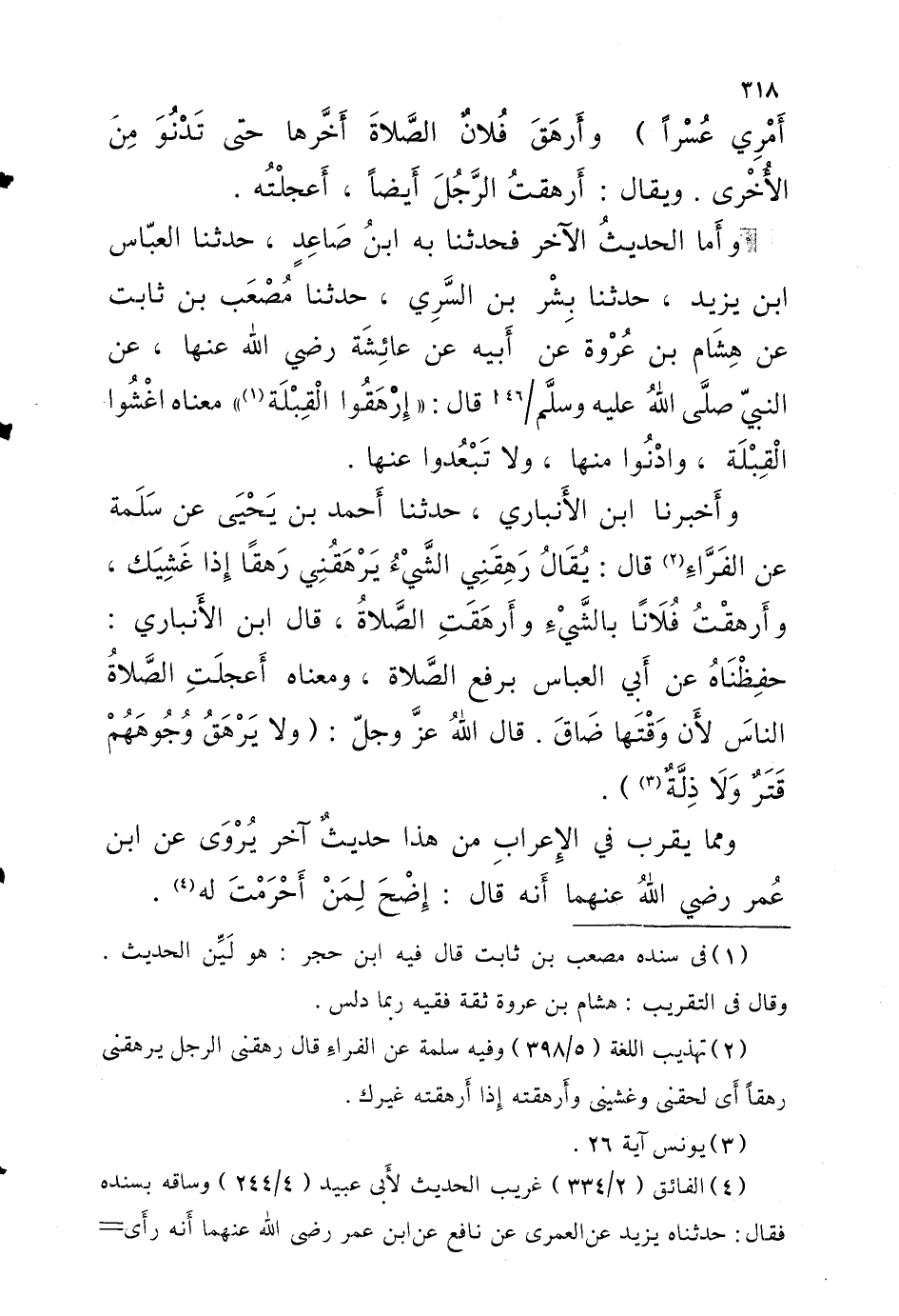 وَأما الحَدِيث الآخِر فَحَدَّثَنَا بِهِ ابْنُ صَاعِدٍ حَدَّثَنَا الْعَبَّاس ابْن يَزِيدَ حَدَّثَنَا بِشْرُ بْنُ السَّرِيِّ حَدَّثَنَا مُصْعَبُ بْنُ ثَابِتٍ عَنْ هِشَامِ بْنِ عُرْوَةَ عَنْ أَبِيهِ عَنْ عَائِشَةَ رَضِيَ اللَّهُ عَنْهَا عَنِ النَّبِيِّ صَلَّى اللَّهُ عَلَيْهِ وَسلم 46 أقَالَ إِرْهَقُوا الْقِبْلَةَ مَعْنَاهُ اغْشُوا الْقِبْلَةَ وَادْنُوا مِنْهَا وَلا تَبْعُدُوا عَنْهَا