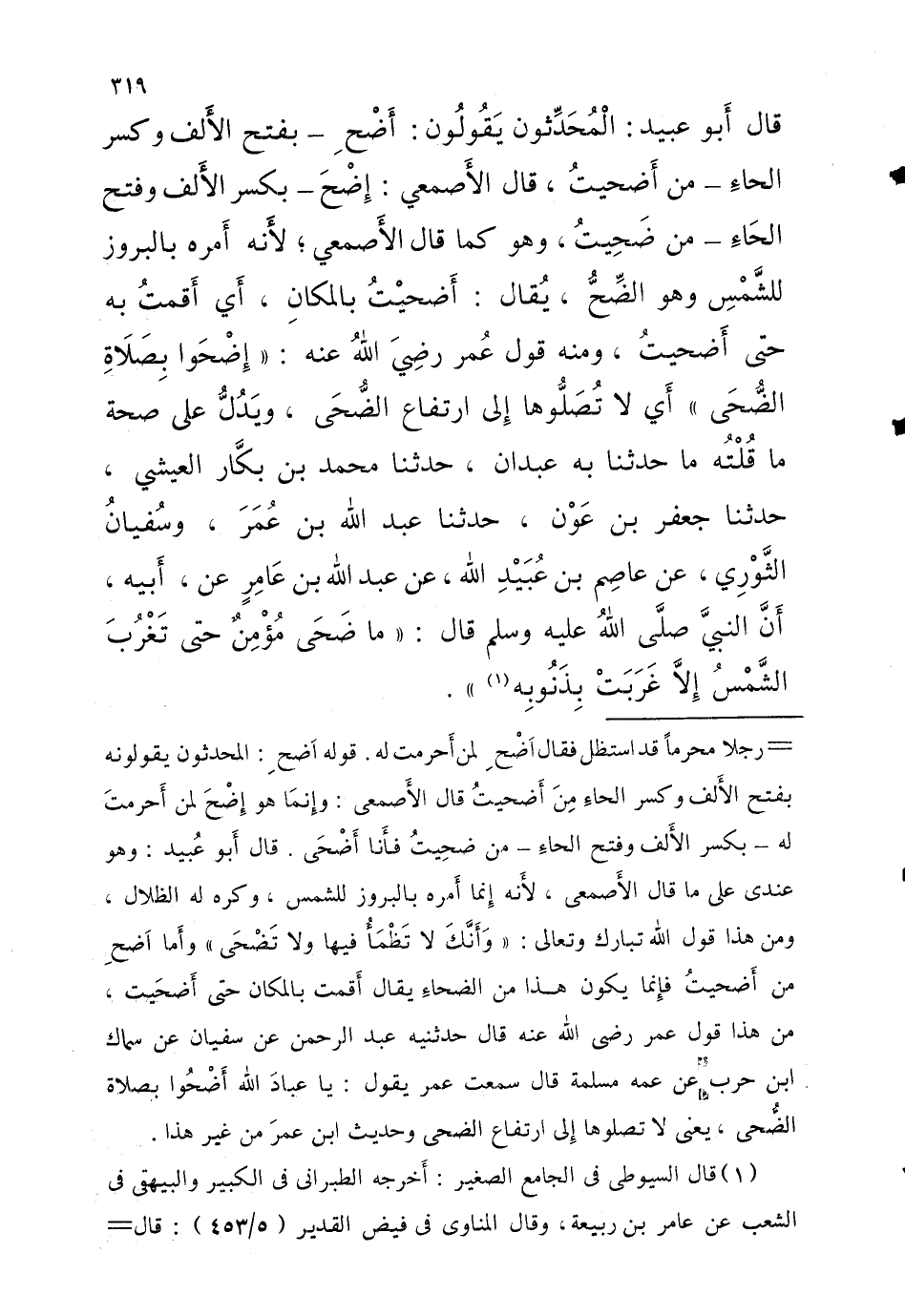 قالَ أَبُو عُبَيْد المْحَدِّثون يَقُولُون أَضْحِ بِفَتْح الْألف وَكسر الحاءِ من أَضحيتُ قالَ الأَصمعي اضْحَ بكر الأَلف وَفتح الحَاءِ من ضَحِيتُ وَهُوَ كَمَا قالَ الأَصمعي لأَنه أَمره بالبروز للشَّمْسِ وَهُوَ الضِّحُّ يُقال أَضحيتُ بِالْمَكَانِ أَي أَقمتُ بِهِ حَتَّى أضحيت وَمِنْه قَول عُمَر رَضِيَ اللَّه عَنْهُ أَضْحَوا بِصَلَاةِ الضُّحَى أَي لَا تُصَلُّوها إِلى ارْتِفَاع الضُّحَى ويَدُلُّ عَلَى صِحَة مَا قُلْتُه مَا حَدَّثَنَا بِهِ عَبْدَانُ حَدَّثَنَا مُحَمَّدُ بْنُ بَكَّارٍ الْعَيْشِيُّ حَدَّثَنَا جَعْفَرُ بْنُ عَوْنٍ حَدَّثَنَا عَبْدُ اللَّهِ بْنُ عُمَرَ وَسُفْيَانُ الثَّوْرِيُّ عَنْ عَاصِمِ بْنِ عُبَيْدِ اللَّهِ عَنْ عَبْدِ اللَّهِ بْنِ عَامِرٍ عَنْ أَبِيهِ أَنّ النَّبِيَّ صَلَّى اللَّهُ عَلَيْهِ وَسَلَّمَ قَالَ مَا ضَحَى مُؤْمِنٌ حَتَّى تَغْرُبَ الشَّمْسُ إِلَّا غَرَبِتْ بِذَنُوبِهِ