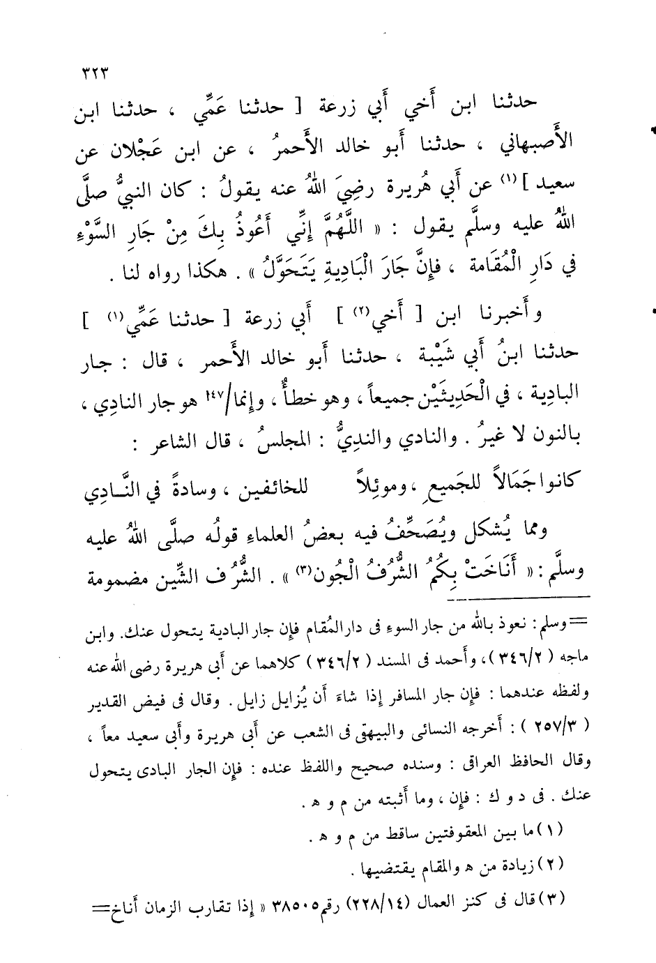 حَدَّثَنَا ابْنُ أَخِي أَبِي زُرْعَةَ حَدَّثَنَا عَمِّي حَدَّثَنَا ابْنُ الأَصْبَهَانِيِّ حَدَّثَنَا أَبُو خَالِدٍ الأَحْمَرُ عَنِ ابْنِ عَجْلانَ عَنْ سَعِيدٍ عَنْ أَبِي هُرَيْرَةَ رَضِيَ اللَّهُ عَنْهُ يَقُولُ كَانَ النَّبِيِّ صَلَّى اللَّهُ عَلَيْهِ وَسَلَّمَ يَقُولُ اللَّهُمَّ إِنِّي أَعُوذُ بِكَ مِنْ جَارِ السَّوْءِ فِي دَارِ الْمُقَامَةِ فإِنَّ جَارَ الْبَادِيَةِ يَتَحَوَّلُ هَكَذَا رَوَاهُ لَنَا