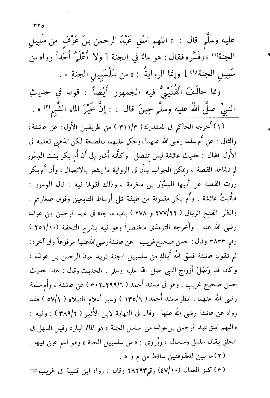 عَلَيْهِ وَسلم قالَ اللَّهُمَّ اسْقِ عَبْد الرَّحْمَن بْن عوْفٍ من سَلِيلِ الْجنَّة وفَسَّره فَقَالَ هُوَ ماءٌ فِي الْجنَّة [وَلَا أَعْلَمُ أَحَدًا رَوَاهُ من سَلِيلِ الْجنَّة] وإِنما الرِّوَايَة من سَلْسَبِيلِ الجنةِ