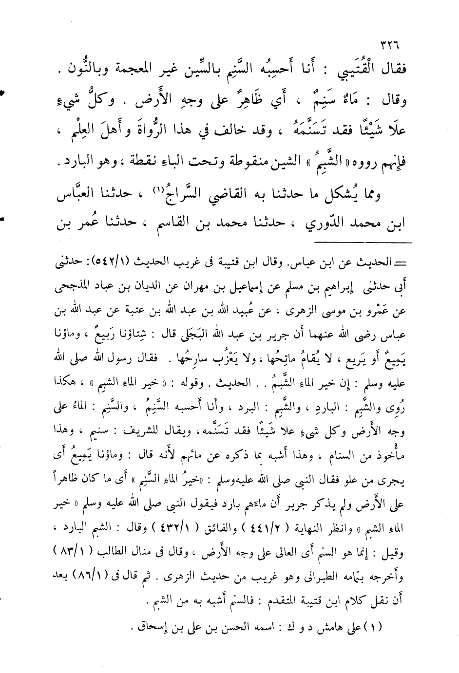 فَقَالَ الْقُتَيْبيُّ أَنا أَحسِبُه السَّنم بالسِّين غير الْمُعْجَمَة وبالنُّون وَقَالَ مَاءٌ سَنِمٌ أَي ظَاهِرٌ عَلَى وجهِ الأَرْض وكلُّ شيءٍ علَا شَيْئًا فقد تِسَنَّمَهُ وَقد خَالف فِي هَذَا الرُّواةَ وأَهلَ العِلْم فإِنهم رَوَوْهُ الشَّبِمُ الشين منقوطة وَتَحْت الباءِ نقطة وَهُوَ الْبَارِد