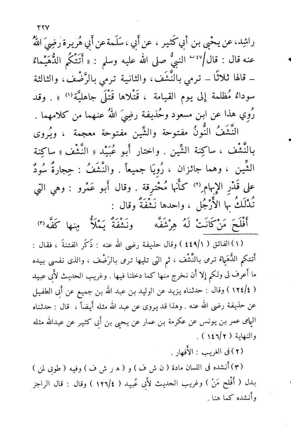 رَاشِدٍ عَنْ يَحْيَى بْنِ أَبِي كَثِيرٍ عَنْ أَبِي سَلَمَةَ عَنْ أَبِي هُرَيْرَةَ رَضِيَ اللَّهُ عَنْهُ قَالَ قَالَ 47 ب النَّبِيَّ صَلَّى اللَّهُ عَلَيْهِ وَسَلَّمَ أَتَتْكُمُ الدُّهَيْمَاءُ قَالَهَا ثَلاثًا تَرْمِي بِالنَّشَفِ وَالثَّانِيَةُ تَرْمِي بِالرَّضْفِ وَالثَّالِثَةُ سَوْدَاءُ مُظْلِمَةٌ إِلَى يَوْمِ الْقِيَامَةِ قَتْلاها قَتْلَى جَاهِلِيَّةٍ وَقَدْ رُوِيَ هَذَا عَنِ ابْنِ مَسْعُودٍ وَحُذَيْفَةَ رَضِيَ اللَّه عَنْهُمَا من كَلَامهمَا