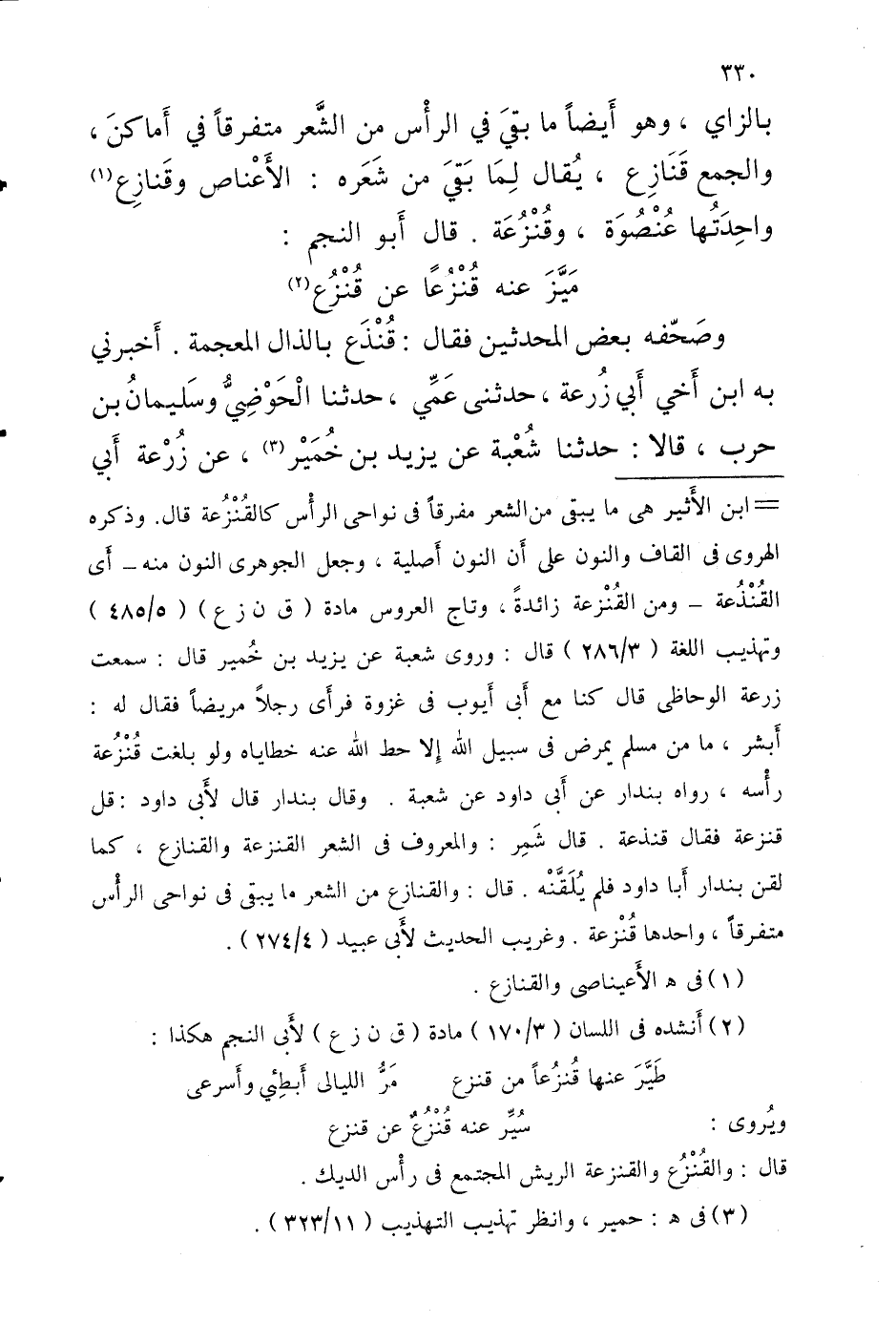 بالزاي وَهُوَ أَيْضا مَا بقيَ فِي الرأْس من الشَّعر مُتَفَرقًا فِي أَماكنَ وَالْجمع قنازع يُقال لِمَا بَقيَ من شَعَره الأَعْناص وقَنازع واحِدَتُها عُنْصُوَة وقُنْزُعَة قالَ أَبُو النَّجْم