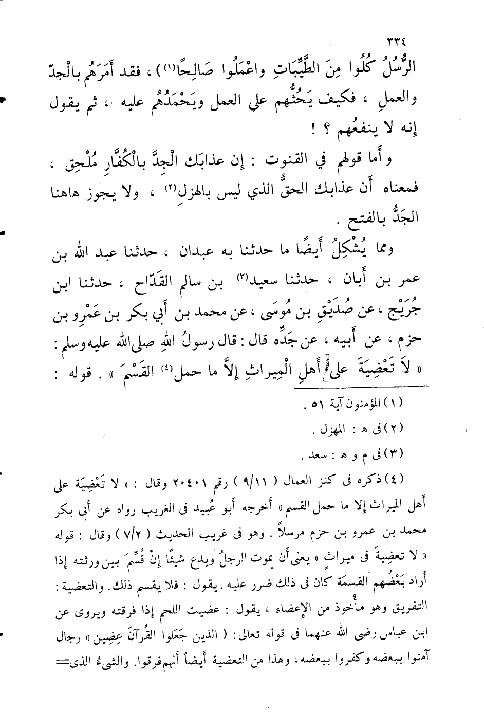 وَمِمَّا يُشْكِلُ أَيْضا مَا حَدَّثَنَا بِهِ عَبْدَانُ حَدَّثَنَا عَبْدُ اللَّهِ بْنُ عُمَرَ بْنِ أَبَانَ حَدَّثَنَا سَعِيدُ بْنُ سَالِمٍ الْقَدَّاحُ حَدَّثَنَا ابْنُ جُرَيْجٍ عَنْ صُدَيْقِ بْنِ مُوسَى عَنْ مُحَمَّدِ بْنِ أَبِي بَكْرِ بْنِ عُمَرِو بْنِ حَزْمٍ عَنْ أَبِيهِ عَنْ جَدِّهِ قَالَ قَالَ رَسُولُ اللَّهِ صَلَّى اللَّهُ عَلَيْهِ وَسَلَّمَ لَا تَعْضِيَةَ عَلَى أَهْلِ الْمِيرَاثِ إِلَّا مَا حَمَلَ الْقَسْمَ قَوْله