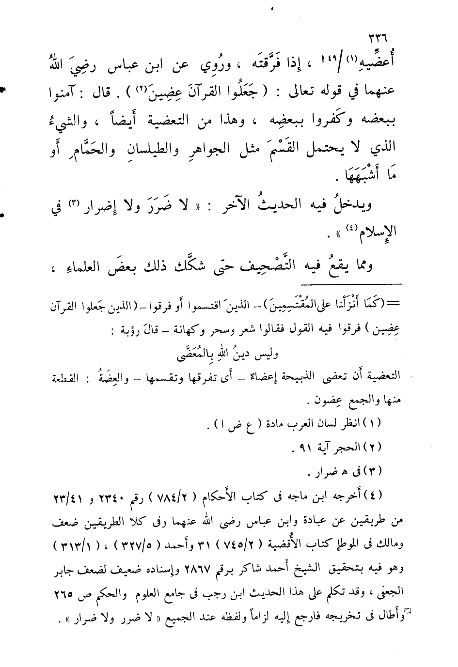 أعضيه 49 أإِذا فَرَّقتَه ورُوِي عَن ابْن عَبَّاس رَضِيَ اللَّه عَنْهُمَا فِي قَوْله تَعَالَى {جعلُوا الْقُرْآن عضين} قالَ آمنُوا بِبَعْضِه وكَفروا ببعضِه وَهَذَا من التعضية أَيضًا والشيءُ الَّذِي لَا يحْتَمل القَسْمَ مثل الجواهرِ والطيلسان والحَمَّامِ أَو مَا أَشْبَهَهَا