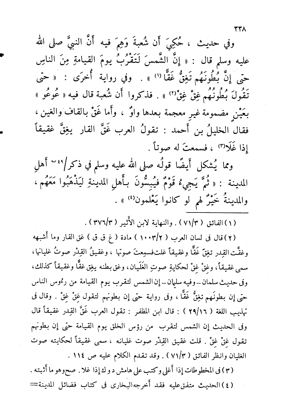وَفِي حَدِيث حُكِيَ أَن شُعْبَة وَهِمَ فِيهِ أَن النَّبِيّ صلى الله عَلَيْهِ وَسلم قالَ إِن الشَّمْس لَتَقْرُبُ يَوْم الْقِيَامَة من النَّاس حَتَّى إِن بُطُونَهُم تَغِقُّ غَقًّا وَفِي رِوَايَة أُخرى حَتَّى تَقُولَ بُطُونُهُم غِقْ غِقْ فَذكرُوا أَن شُعْبَة قَالَ فِيهِ عُوعُو بعينِ مَضْمُومَة غير مُعْجمَة بعْدهَا واوٌ وأَما غَقْ بِالْقَافِ والغين فَقَالَ الخليلُ بْن أَحْمَد تقولُ الْعَرَب غَقَّ القار يغِقَّ غقيقًا إِذا غَلَا فسمعتَ لَهُ صَوتا