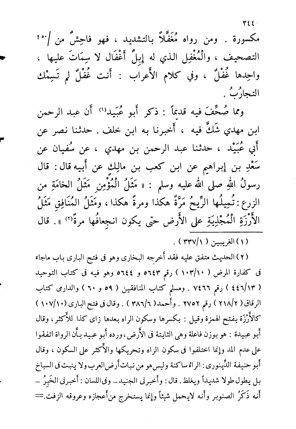 وَمِمَّا صُحِّفَ فِيهِ قَدِيما ذكر أَبُو عبيد أَن عبد الرَّحْمَن ابْن مهْدي شكَّ فِيهِ أَخْبَرَنَا بِهِ ابْنُ خَلَفٍ حَدَّثَنَا نَصْرٌ عَنْ أَبِي عُبَيْدٍ حَدَّثَنَا عَبْدُ الرَّحْمَنِ بْنُ مَهْدِيٍّ عَنْ سُفْيَانَ عَنْ سَعْدِ بْنِ إِبْرَاهِيمَ عَنِ ابْنِ كَعْبِ بْنِ مَالِكٍ عَنْ أَبِيهِ قَالَ قَالَ رَسُول اللَّهِ صَلَّى اللَّهُ عَلَيْهِ وَسَلَّمَ مَثَلُ الْمُؤْمِنِ مَثَلُ الْخَامَةِ مِنَ الزَّرْعِ تُمِيلُهَا الرِّيحُ مَرَّةً هَكَذَا وَمَرَّةً هَكَذَا وَمثل الْمُنَافِق مثل الْأرز الْمَجْذِيَّةِ عَلَى الأَرْضِ حَتَّى يَكُونَ انْجِعَافُهَا مَرَّةً قَالَ