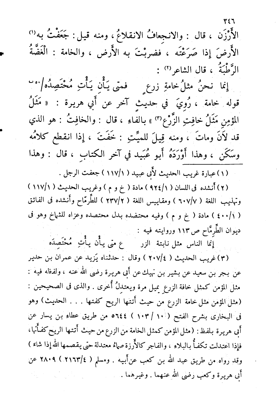 قَوْله خامة رُوِيَ فِي حديثٍ آخر عَن أَبِي هُرَيْرَةَ مَثَلُ الْمُؤمن مثل خافتِ الزرْع بالفاءِ قالَ والخافِتُ هُوَ الَّذِي قد لَانَ وماتَ وَمِنْه قيل للميِّتِ خَفَتَ إِذا انْقَطع كلامُه وسَكَن وَهَذَا أَوْرَدَهُ أَبُو عُبَيْد فِي آخر الكتابِ قالَ وَهَذَا