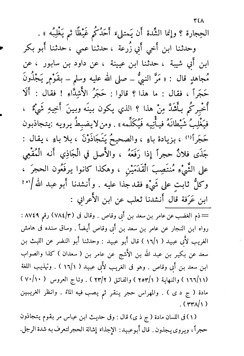 وَحَدَّثَنَا ابْنُ أَخِي أَبِي زُرْعَةَ حَدَّثَنَا عمي حَدثنَا أَبُو بكر ابْن أَبِي شَيْبَةَ حَدَّثَنَا ابْنُ عُيَيْنَةَ عَنْ دَاوُدَ بْنِ سَابُورٍ عَنْ مُجَاهِدٍ قَالَ مَرَّ النَّبِيُّ صَلَّى اللَّهُ عَلَيْهِ وَسَلَّمَ بِقَوْمٍ يَجْذُونَ حَجَرًا فَقَالَ مَا هَذَا قَالُوا حَجَرُ الأَشِدَّاءِ فَقَالَ أَلَا أُخْبِرُكُمْ بِأَشَدَّ مِنْ هَذَا الَّذِي يَكُونُ بَيْنَهُ وَبَيْنَ أَخِيهِ شَيْءٌ فَيَغْلِبُ شَيْطَانَهُ فَيَأْتِيهِ فَيُكَلِّمُهُ وَمن لَا يضبطُ يرويهِ يتجاذبون حَجَرًا بِزِيَادَة باءٍ وَالصَّحِيح يَتَجَاذَوْنَ بِلَا باءٍ يُقَالُ جَذَى فلانٌ حجرا إِذا رَفَعَهُ والأَصل فِي الجاذي أنَّه المُقْعِي عَلَى الشَّيْءِ مُنتَصِبَ الْقَدَمَيْنِ وَهَكَذَا كَانُوا يرفَعُون الحجرَ وكلُّ ثابتٍ عَلَى شَيْءٍ فقد جذا عَلَيْهِ وأَنشدنا أَبو عَبْد اللَّه 51 أابْن عَرَفَة قالَ أنشدنا ثَعْلَب عَن ابْن الأَعرابي
