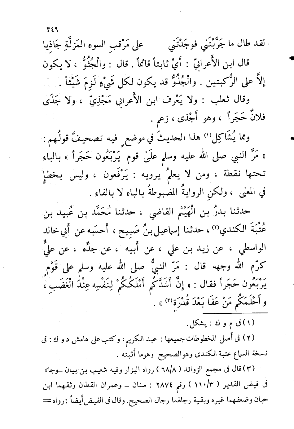 حَدَّثَنَا بَدْرُ بْنُ الْهَيْثَمِ الْقَاضِي حَدَّثَنَا مُحَمَّدُ بْنُ عُبَيْدِ بْنِ عُتْبَةَ الْكِنْدِيُّ حَدَّثَنَا إِسْمَاعِيلُ بْنُ صُبَيْحٍ أَحْسَبُهُ عَنْ أَبِي خَالِدٍ الْوَاسِطِيُّ عَنْ زَيْدِ بْنِ عَلِيٍّ عَنْ أَبِيهِ عَنْ جَدِّهِ عَنْ عَلِيٍّ كَرَّمَ اللَّهُ وَجْهَهُ قَالَ مَرَّ النَّبِيُّ صَلَّى اللَّهُ عَلَيْهِ وَسلم عَلَى قوم يَرْبَعُون حَجَرًا فَقَالَ إِنَّ أَشَدَّكُمْ أَمْلَكُكَُُمْ لِنَفْسِه عِنْدَ الْغَضَبِ وَأَحْلَمَكُمْ مَنْ عَفَا بَعْدَ قُدْرَةٍ