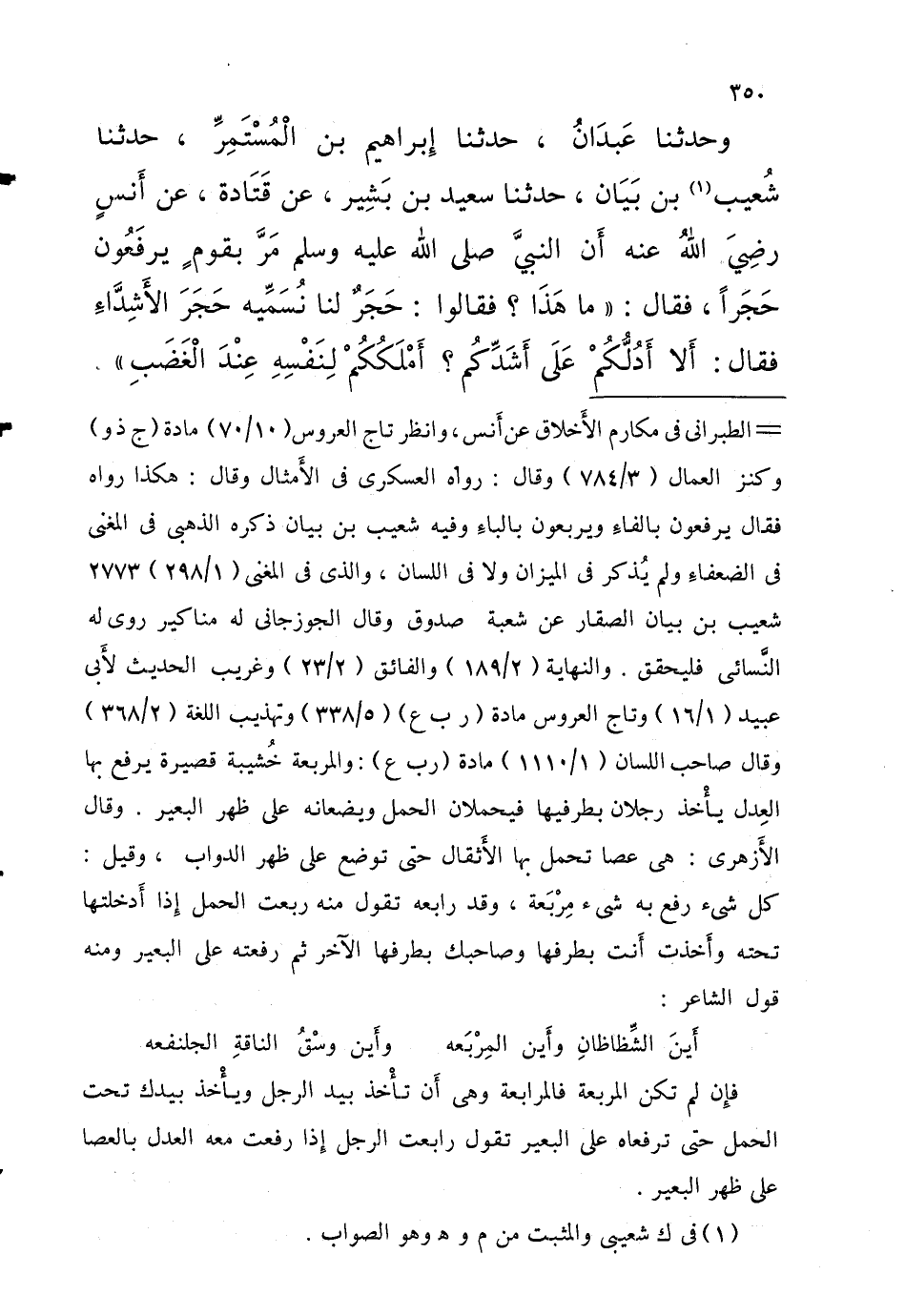 وَحَدَّثَنَا عَبْدُانُ حَدَّثَنَا إِبْرَاهِيمُ بْنُ الْمُسْتَمِرِّ حَدَّثَنَا شُعَيْبُ بْنُ بَيَانٍ حَدَّثَنَا سَعِيدِ بْنِ بَشِيرٍ عَنْ قَتَادَةَ عَنْ أَنَسٍ رَضِيَ اللَّهُ عَنْهُ أَن النَّبِيّ صلى الله عَلَيْهِ وَسَلَّمَ مَرَّ بقَوْمٍ يَرْفَعُونَ حَجَرًا فَقَالَ مَا هَذَا فَقَالُوا حَجَرٌ لَنَا نُسَمِّيهِ حَجَرَ الأَشِدَّاءِ فَقَالَ أَلا أَدُلُّكُمْ عَلَى أَشَدِّكُمْ أَمْلَكُكُمْ لِنَفْسِهِ عِنْدَ الْغَضَبِ