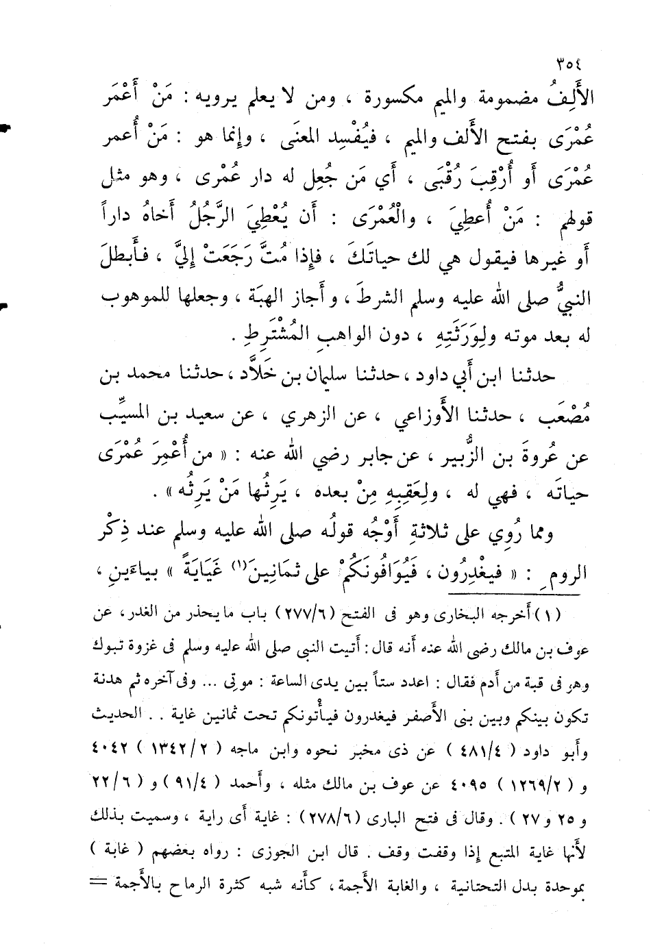 الأَلِفُ مَضْمُومَة وَالْمِيم مَكْسُورَة وَمن لَا يعلم يرويهِ مَنْ أَعْمرَ عُمْرَى بِفَتْح الأَلف وَالْمِيم فيُفْسِد الْمَعْنى وإِنما هُوَ مَنْ أعمر عمري أَو أرقب رُقْبَى أَي من جُعِل لَهُ دَار عُمْري وَهُوَ مثل قَوْلهم من أُعطِيّ والعُمْري أَن يُعْطِيَ الرَّجُلُ أَخَاهُ دَارا أَو غَيرهَا فَيَقُول هِيَ لَك حياتك فَإِذا مت رجعت إِلَيّ فَأبْطل النَّبِي صلى الله عَلَيْهِ وَسلم الشرطَ وأَجاز الهبَة وَجعلهَا للْمَوْهُوب لَهُ بعد مَوته ولِوَرَثَتِهِ دون الواهبِ الْمُشْتَرِطِ