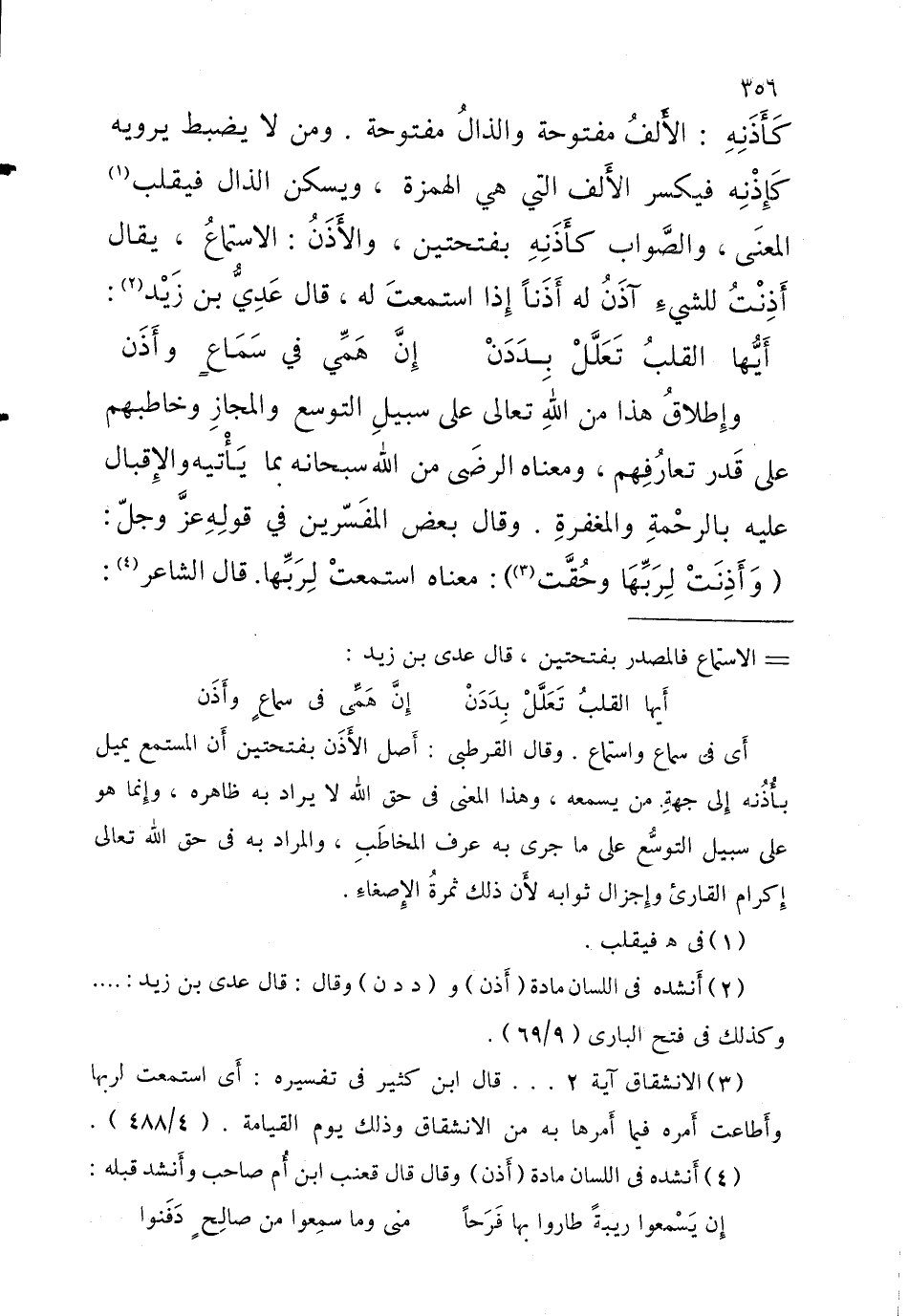 كأَذِنِهِ الأَلف مَفْتُوحَة والذالُ مَفْتُوحَة وَمن لَا يضْبط يرويهِ كَإِذْنِه فيكسر الأَلف الَّتِي هِيَ الْهمزَة ويسكن الذَّال فيقلب الْمَعْنى والصَّواب كأَذَنِهِ بِفتْحَتَيْنِ والأَذَنُ الاستماعُ يُقَالُ أَذِنْتَ للشيءِ آذَنُ لَهُ أَذَنًا إِذا استمعتَ لَهُ قالَ عَدِيُّ بْن زَيْد