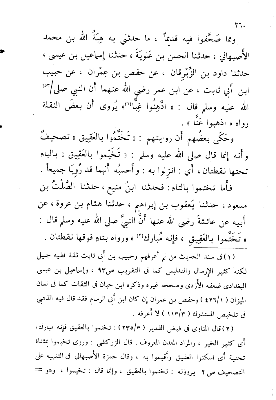 فَأَما تختموا بالتاءِ فَحَدَّثَنَا ابْنُ مَنِيعٍ حَدَّثَنَا الصَّلْتُ بْنُ مَسْعُودٍ حَدَّثَنَا يَعْقُوبُ بْنُ إِبْرَاهِيمَ حَدَّثَنَا هِشَامُ بْنِ عُرْوَةَ عَنْ أَبِيهِ عَنْ عَائِشَةَ رَضِيَ اللَّهُ عَنْهَا أَنّ النَّبِيَّ صَلَّى اللَّهُ عَلَيْهِ وَسَلَّمَ قَالَ تَخَتَّمُوا بِالْعَقِيقِ فَإِنَّهُ مُبَارَكٌ وَرَوَاهُ بِتَاءٍ فَوْقَهَا نُقْطَتَانِ