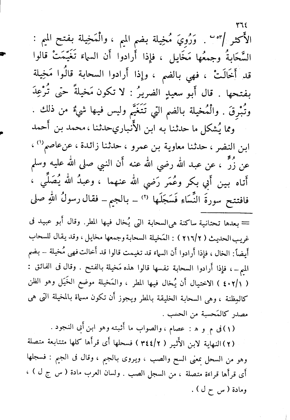 وَمِمَّا يشكل مَا حَدَّثَنَا بِهِ ابْنُ الأَنْبَارِيُّ حَدَّثَنَا مُحَمَّدُ بْنُ أَحْمد ابْن النَّضْرِ حَدَّثَنَا مُعَاوِيَةُ بْنُ عَمْرٍو حَدَّثَنَا زَائِدَةُ عَنْ عَاصِمٍ عَنْ زِرٍّ عَنْ عَبْدِ اللَّهِ رَضِيَ اللَّه عَنْهُ أَن النَّبِيّ صلى اللَّهُ عَلَيْهِ وَسَلَّمَ أَتَاهُ بَيْنَ أَبِي بَكْرٍ وَعُمَرَ رَضِيَ اللَّهُ عَنْهُمَا وَعَبْدُ اللَّهِ يُصَلِّي فَافْتَتَحَ سُورَةَ النِّسَاءِ فَسَجَّلَهَا بِالْجِيمِ فَقَالَ رَسُولِ اللَّهِ صَلَّى