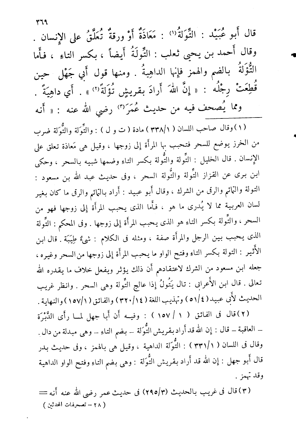 قالَ أَبُو عُبَيْد التِّوَلةُ معاذةٌ أَو ورقةٌ تُعَلَّقُ عَلَى الإِنسان وَقَالَ أَحْمَد بْن يحيى ثَعْلَب التَّولَةُ أَيْضا بِكَسْر التاءِ فأَما التُّؤَلةُ بِالضَّمِّ والهمز فَإِنَّهَا الداهيةُ وَمِنْهَا قَول أَبي جَهْل حِين قِطِعَتْ رجله إِن اللَّه أَرادَ بقريشٍ تُؤَلَةً أَي داهيةً