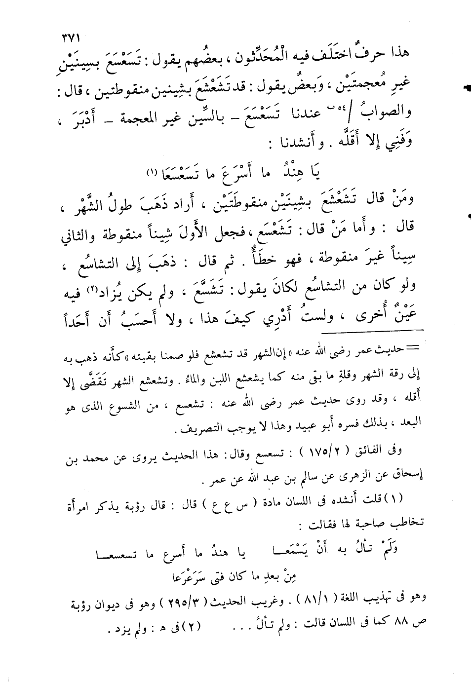 وَمن قالَ تشعشع بشينين منقوطتين أَرَادَ ذهب طول الشَّهْر قالَ وَأما من قالَ تشعسع فَجعل الأول شينًا منقوطة وَالثَّانِي سينًا غير منقوطة فَهُوَ خطَأٌ ثُمَّ قالَ ذهَبَ إِلَى التشاسُع وَلَو كَانَ من التشاسُع لكانَ يَقُول تَشَسَّع وَلم يكن يُزاد فِيهِ عَيْنٌ أُخرى ولستُ أدْرِي كَيفَ هَذَا وَلَا أَحسبُ أَن أحدا