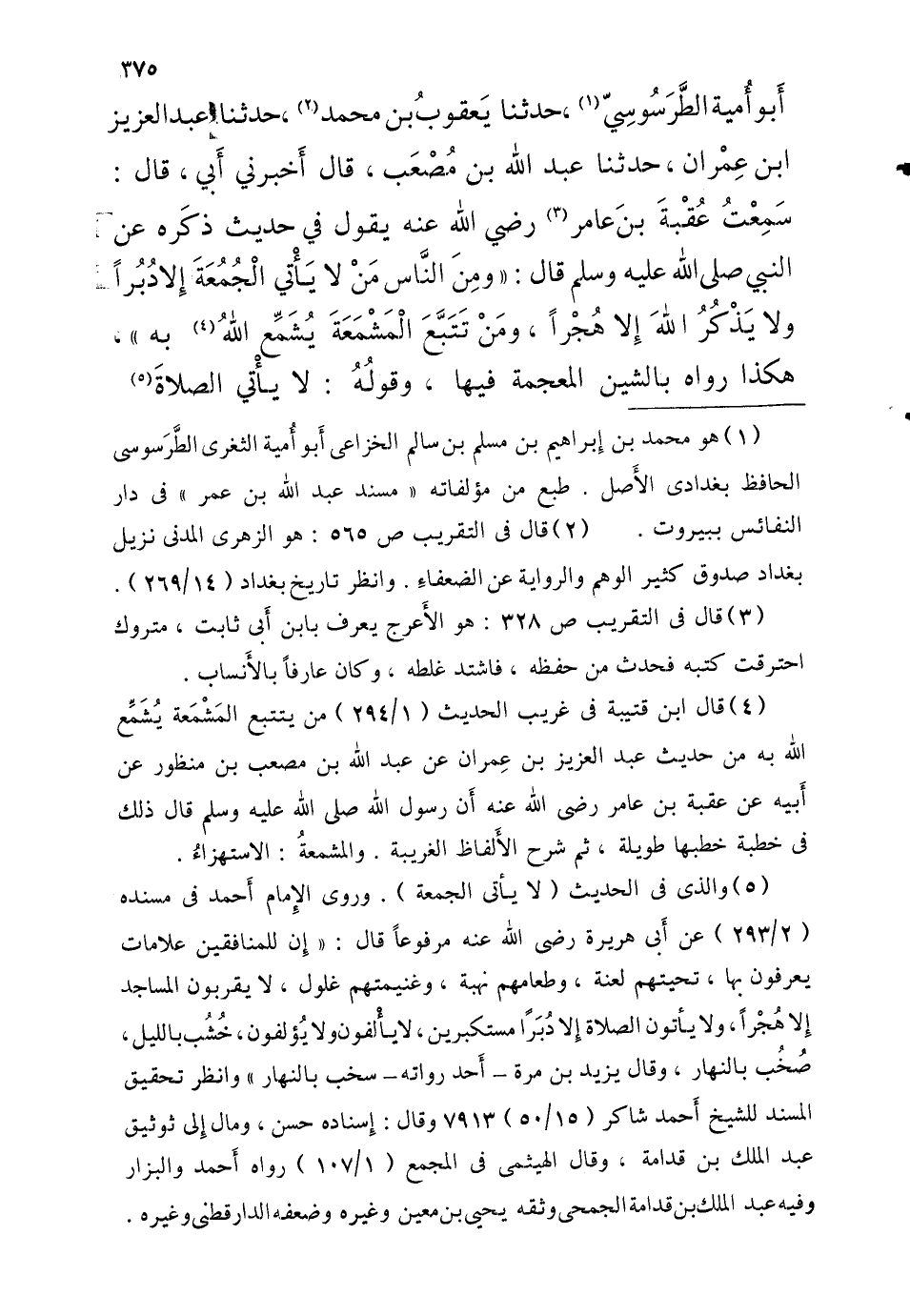 أبوأمية الطَّرْسُوسِيُّ حَدَّثَنَا يَعْقُوبُ بْنُ مُحَمَّدٍ حَدثنَا عبد الْعَزِيز ابْن عِمْرَانَ حَدَّثَنَا عَبْدُ اللَّهِ بْنُ مُصْعَبٍ قَالَ أَخْبَرَنِي أَبِي قَالَ سَمِعْتُ عُقْبَةَ بْنَ عَامِرٍ رَضِيَ اللَّهُ عَنْهُ يَقُولُ فِي حَدِيثٍ ذَكَرَهُ عَنِ النَّبِيِّ صَلَّى اللَّهُ عَلَيْهِ وَسَلَّمَ قَالَ وَمِنَ النَّاسِ مَنْ لَا يَأْتِي الْجُمُعَةَ إِلا دُبُرًا وَلا يَذْكُرُ اللَّهَ إِلا هُجْرًا وَمَنْ تَتَبَّعَ الْمَشْمَعْةَ يُشَمِّعُ اللَّهُ بِهِ هَكَذَا رَوَاهُ بالشين الْمُعْجَمَة فِيهَا وقولُهُ لَا يَأْتِي الصَّلَاة
