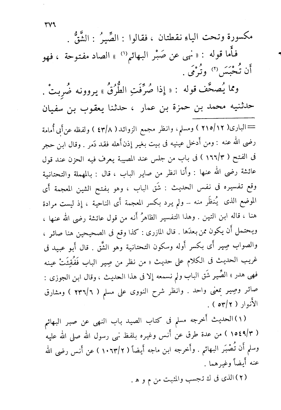 فأَما قَوْله نهى عَن صَبْر الْبَهَائِم الصَّاد مَفْتُوحَة فَهُوَ أَن تُحْبَس وتُرْمَى