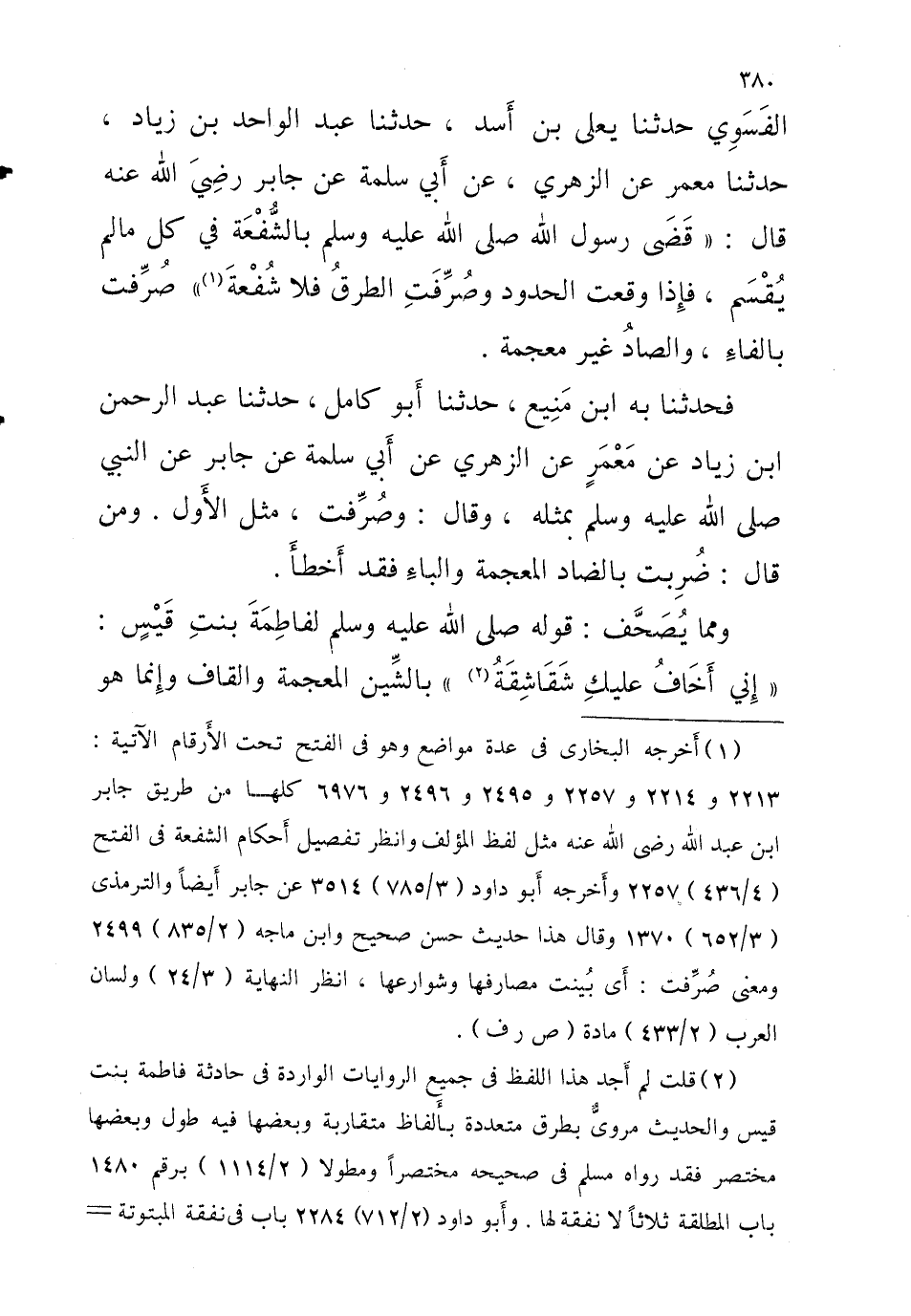 الْفَسَوِيُّ حَدَّثَنَا يَعْلَى بْنُ أَسَدٍ حَدَّثَنَا عَبْدُ الْوَاحِدِ بْنُ زِيَادٍ حَدَّثَنَا مَعْمَرٌ عَنِ الزُّهْرِيِّ عَنْ أَبِي سَلَمَةَ عَنْ جَابِرٍ رَضِيَ اللَّهُ عَنْهُ قَالَ قَضَى رَسُولُ اللَّهِ صَلَّى اللَّهُ عَلَيْهِ وَسَلَّمَ بِالشُّفْعَة فِي كل مالم يُقْسَمْ فَإِذَا وَقَعَتِ الْحُدُودُ وَصُرِّفَتِ الطرق فَلا شُفْعَةَ صُرِّفَتْ بِالْفَاءِ وَالصَّادُ غَيْرُ مُعْجَمَةٍ