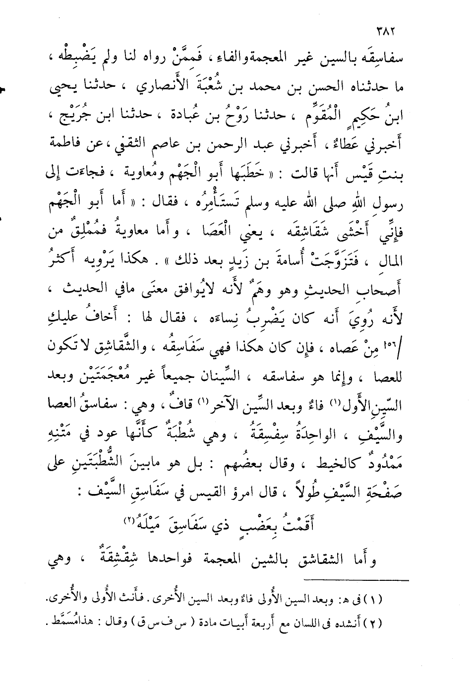 سفاسِقَه بِالسِّين غير الْمُعْجَمَة والفاءِ فَمِمَّنْ رَوَاهُ لنا وَلم يضبطه مَا حَدَّثَنَاهُ الْحَسَنُ بْنُ مُحَمَّدِ بْنِ شُعْبَةَ الْأَنْصَارِيُّ حَدَّثَنَا يَحْيَى ابْن حَكِيمٍ الْمُقَوِّمُ حَدَّثَنَا رَوْحُ بْنُ عُبَادَةَ حَدَّثَنَا ابْنُ جُرَيْجٍ أَخْبَرَنِي عَطَاءٌ أَخْبَرَنِي عَبْدُ الرَّحْمَنِ بْنُ عَاصِمٍ الثَّقَفِيُّ عَنْ فَاطِمَةَ بِنْتِ قَيْسٍ أَنَّهَا قَالَتْ خَطَبَهَا أَبُو الْجَهْمِ وَمُعَاوِيَةُ فَجَاءَتْ إِلَى رَسُولِ اللَّهِ صَلَّى اللَّهُ عَلَيْهِ وَسَلَّمَ تَسْتَأْمِرُهُ فَقَالَ أَمَّا أَبُو الْجَهْمِ فَإِنِّي أَخْشَى شَقَاشِقَهُ يَعْنِي الْعَصَا وَأَمَّا مُعَاوِيَةُ فَمُمْلِقٌ مِنَ الْمَالِ فَتَزَوَّجَتْ أُسَامَةَ بْنَ زَيْدٍ بَعْدَ ذَلِكَ هَكَذَا يَرْوِيه أَكثرُ أَصحابِ الحَدِيث وَهُوَ وهم لِأَنَّهُ لايوافق معنى مَا فِي الحَدِيث لأَنه رُوِيَ أَنه كَانَ يَضْرِبُ نِساءَه فَقَالَ لَهَا أَخَاف عَلَيْك 56 أمِنْ عَصاه فإِن كَانَ هَكَذَا فَهِيَ سفاسقه والشقاشق لَا تكون للعصا وإِنما هُوَ سفاسقه السِّينان جَمِيعًا غير مُعْجَمَتَيْن وَبعد السِّين الأَول فاءٌ وَبعد السِّين الآخر قافٌ وَهِي سفاسقُ الْعَصَا والسَّيْفِ الواحِدَةُ سِفْسِقَةُ وَهِي شُطْبَةٌ كأَنَّها عود فِي مَتْنِه مَمْدُودٌ كالخيط وَقَالَ بَعضهم بل هُوَ مَا بَين الشُّطْبَتَينِ عَلَى صَفْحَةِ السَّيْفِ طُولًا قالَ امْرُؤ الْقَيْس فِي سَفَاسِقِ السَّيْف