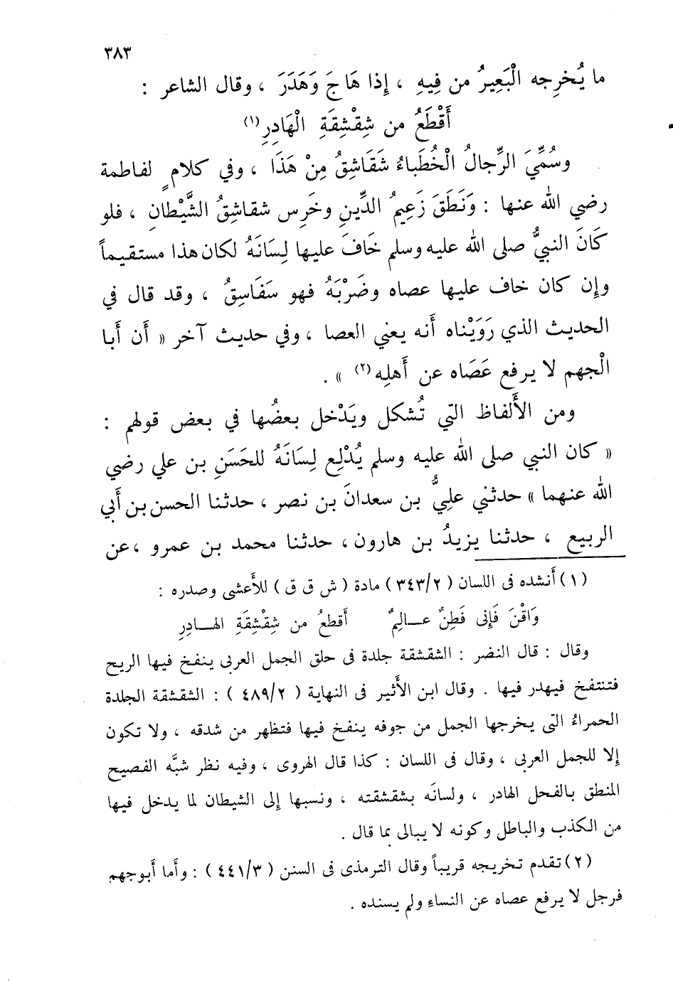 وَسمي الرِّجَال الخطباء شقاشق من هَذَا وَفِي كَلَام لفاطمة رَضِيَ اللَّه عَنْهَا ونَطَقَ زعيم الدّين وخرس شقاشق الشَّيْطَان فَلَو كَانَ النَّبِيُّ صَلَّى اللَّهُ عَلَيْهِ وَسلم خَافَ عَلَيْهَا لِسَانَهُ لَكَانَ هَذَا مُسْتَقِيمًا وإِن كَانَ خَافَ عَلَيْهَا عَصَاهُ وضَرْبَهُ فَهُوَ سَفَاسِقُ وَقد قالَ فِي الحَدِيث الَّذِي رَوَيْناه أَنه يَعْنِي الْعَصَا وَفِي حَدِيث آخر أَن أَبا الْجهم لَا يرفع عَصَاه عَن أَهلِه وَمن الأَلفاظ الَّتِي تُشكل ويَدْخل بعضُها فِي بعض قَوْلهم كَانَ النَّبِيَّ صَلَّى اللَّهُ عَلَيْهِ وَسَلَّمَ يُدْلِع لِسَانَهُ للحَسَنِ بْن عَليّ رَضِيَ اللَّه عَنْهُمَا حَدَّثَنِي عَلِيُّ بْنُ سَعْدَانَ بْنِ نَصْرٍ حَدَّثَنَا الْحَسَنُ بْنُ أَبِي الرَّبِيعِ حَدَّثَنَا يَزِيدُ بْنُ هَارُونَ حَدَّثَنَا مُحَمَّدُ بْنُ عَمْرٍو عَنْ