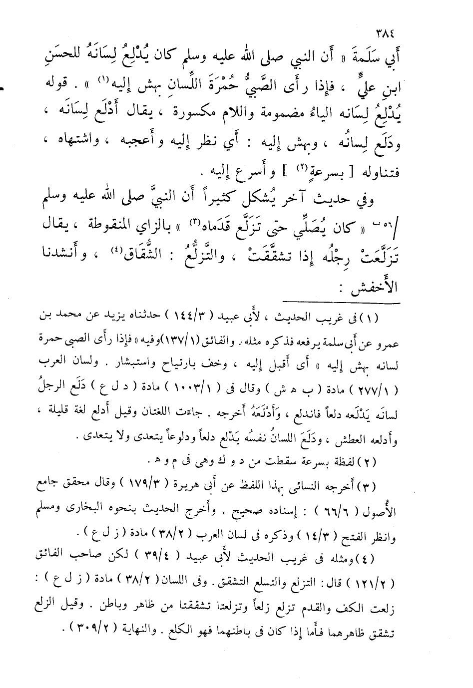 أَبِي سَلَمَةَ أَنَّ النَّبِيَّ صَلَّى اللَّهُ عَلَيْهِ وَسَلَّمَ كَانَ يُدْلِعُ لِسَانه لِلْحسنِ ابْن عَلِيٍّ فَإِذَا رَأَى الصَّبِيُّ حُمْرَةَ اللِّسَانِ بَهَشَ إِلَيْهِ قَوْله يُدْلِعُ لِسَانَه الياءُ مَضْمُومَة وَاللَّام مَكْسُورَة يُقَالُ أَدْلَع لِسَانَه ودَلَع لِسانُه وبهش إِليه أَي نظر إِلَيْهِ وأَعجبه واشتهاه فتناوله [بسرعةٍ] وأَسرع إِليه