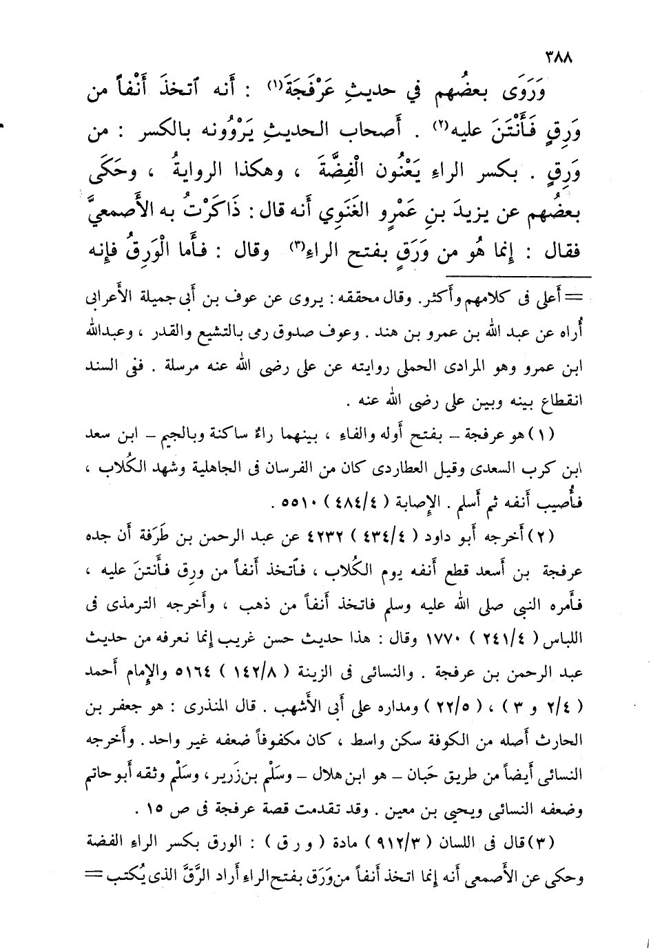 وَرَوَى بعضُهم فِي حَدِيث عرْفجَة أَنه اتخذ أنفًا من ورق فَأَنْتن عَلَيْهِ أَصْحَاب الحَدِيث يَرْوُونَهُ بِالْكَسْرِ من وَرِقٍ بِكَسْر الراءِ يَعْنُون الْفِضَّةَ وَهَكَذَا الروايةُ وحَكَى بعضُهم عَن يزيدَ بْن عمروٍ الغَنَوي أَنه قالَ ذَاكَرْتُ بِهِ الأَصمعيَّ فَقَالَ إِنما هُو من وَرَقٍ بِفَتْح الراءِ وَقَالَ فأَما الْوَرِقُ فإِنه