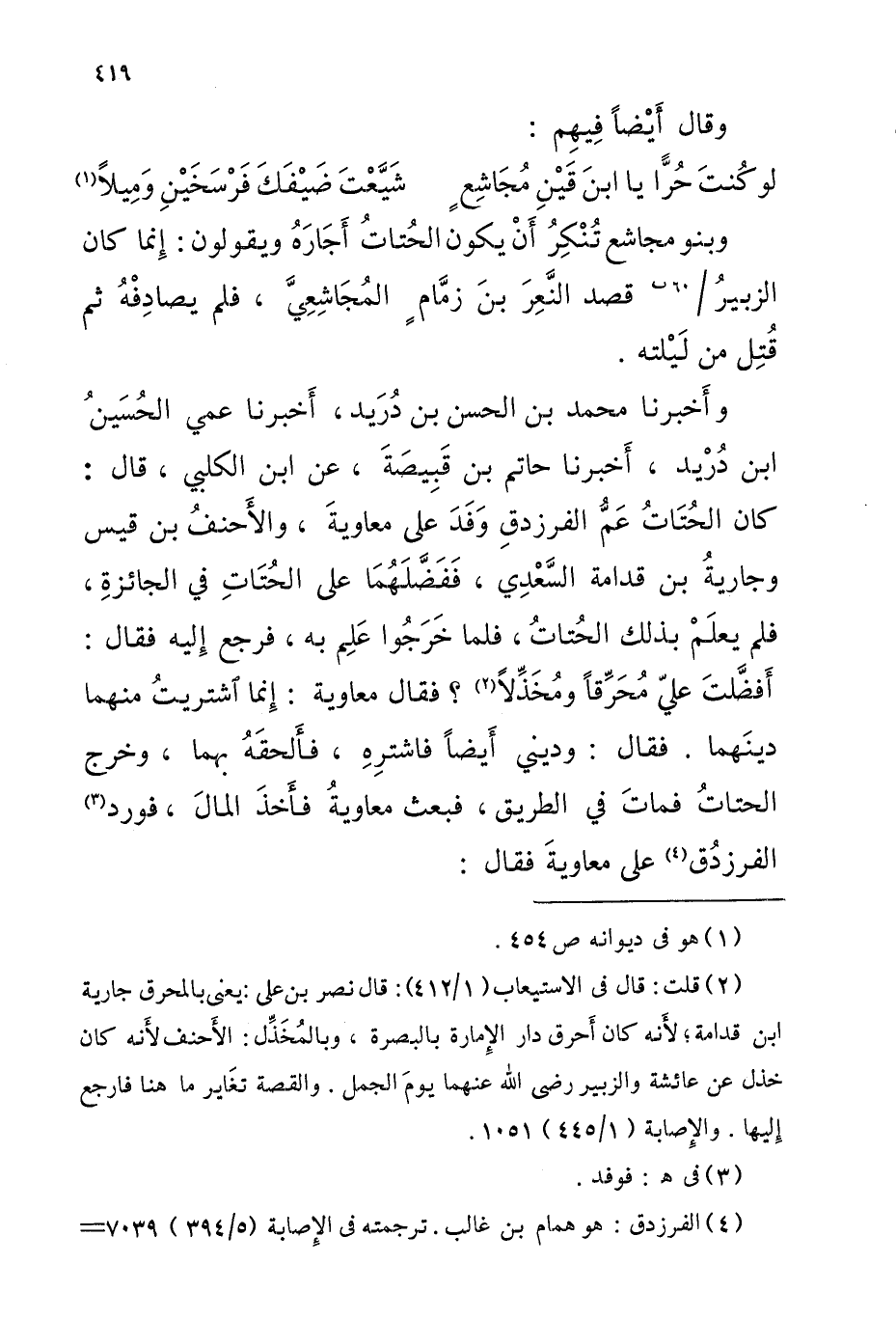 وَبَنُو مجاشع تنكر أَن يكون الحتات أجاره وَيَقُولُونَ إِنَّمَا كَانَ الزبير 60 ب قصد النَّعِرَ بنَ زمَّامٍ الْمُجَاشِعِيَّ قلم يصادِفْهُ ثُمَّ قُتِل من لَيْلته وَأَخْبَرَنَا مُحَمَّدُ بْنُ الْحَسَنِ بْنِ دُرَيْد أخبرنَا عمي الْحُسَيْن ابْن دُرَيْد أخبرنَا حَاتِم بن فبيصة عَنِ ابْنِ الْكَلْبِيِّ قَالَ كَانَ الْحُتَاتُ عَمُّ الْفَرْزَدَقِ وَفَدَ عَلَى مُعَاوِيَةَ وَالأَحْنَفُ بْنُ قَيْسٍ وَجَارِيَةُ بْنُ قُدَامَةَ السَّعْدِيِّ فَفَضَّلَهُمَا عَلَى الْحُتَاتِ فِي الْجَائِزَةِ فَلَمْ يَعْلَمْ بِذَلِكَ الْحُتَاتُ فَلَمَّا خَرَجُوا عَلِمَ بِهِ فَرَجَعَ إِلَيْهِ فَقَالَ أَفَضَّلْتَ عَلَيَّ مُحَرَّقًا وَمُخَذَّلا فَقَالَ مُعَاوِيَةُ إِنَّمَا اشْتَرَيْتُ مِنْهُمَا دَيْنَهُمَا فَقَالَ وَدَيْنِي أَيْضًا فَاشْتَرِهِ فَأَلْحَقَهُ بِهِمَا وَخَرَجَ الْحُتَاتُ فَمَاتَ فِي الطَّرِيقِ فَبَعَثَ مُعَاوِيَةُ فَأَخَذَ الْمَالَ فَوَرَدَ الْفَرَزْدَقُ عَلَى مُعَاوِيَةَ فَقَالَ