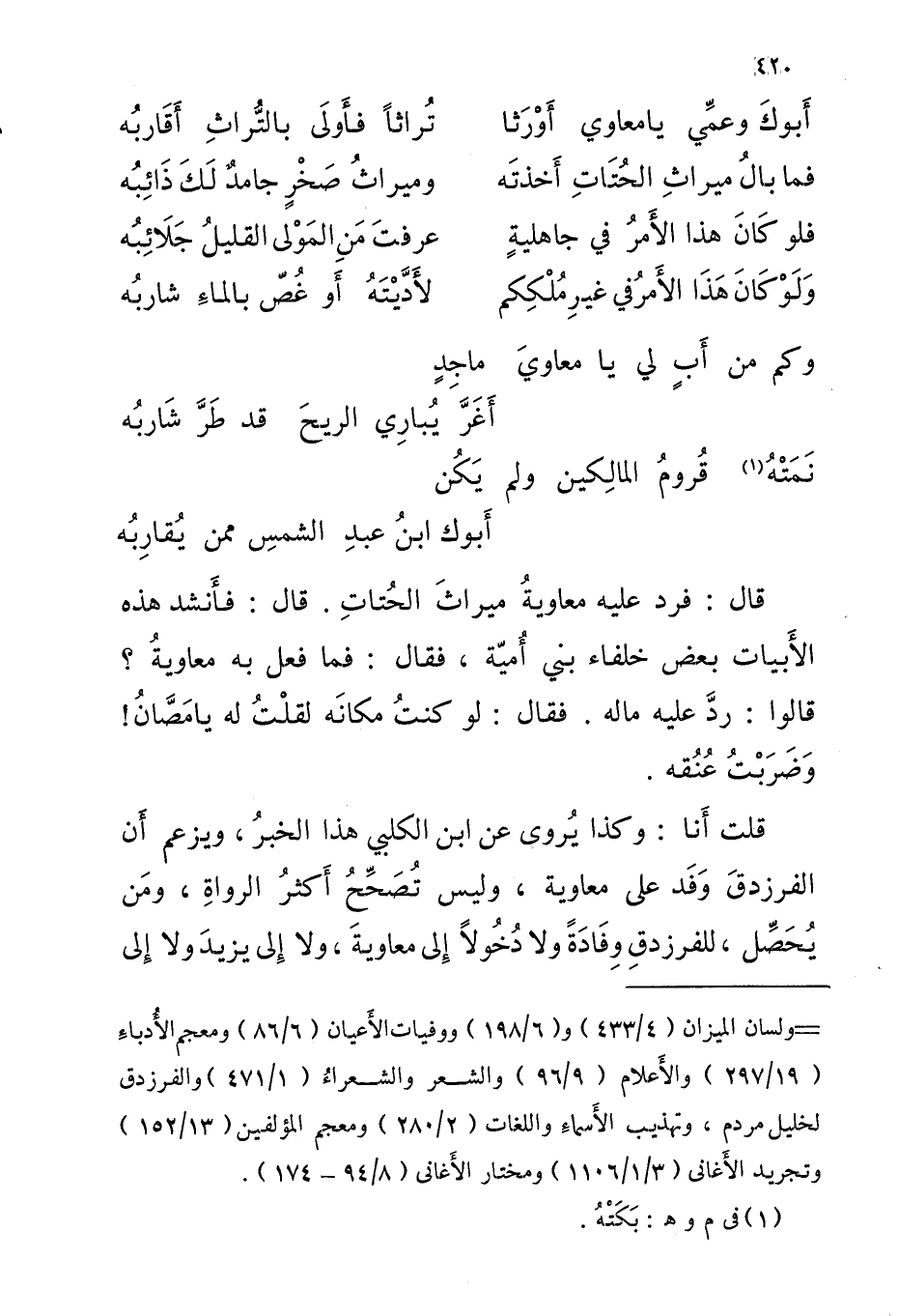 قالَ فَرَدَّ عَلَيْهِ مُعَاوِيَةُ مِيرَاثَ الحُتَاتِ قَالَ فَأُنْشِدَ هَذِه الأبيات بعض خلفا بَنِي أُمَيَّةَ فَقَالَ فَمَا فَعَلَ بِهِ مُعَاوِيَةُ قَالُوا رَدَّ عَلَيْهِ مَالَهُ فَقَالَ لَوْ كُنْتُ مَكَانَهُ لَقُلْتُ لَهُ يَا مَصَّانُ وَضَرَبْتُ عُنُقَهُ قلتُ أَنَا وَكَذَا يروي عَن ابْن الْكَلْبِيّ هَذَا الخبرُ وَيَزْعُم أَن الفرزدق وَفد عَلَى مُعَاوِيَة وَلَيْسَ تصحح أَكثر الروَاة وَمن يحصل للفرزدق وفادةً وَلَا دُخُولًا إِلى مُعَاوِيَة وَلَا إِلَى يزِيد وَلَا إِلَى
