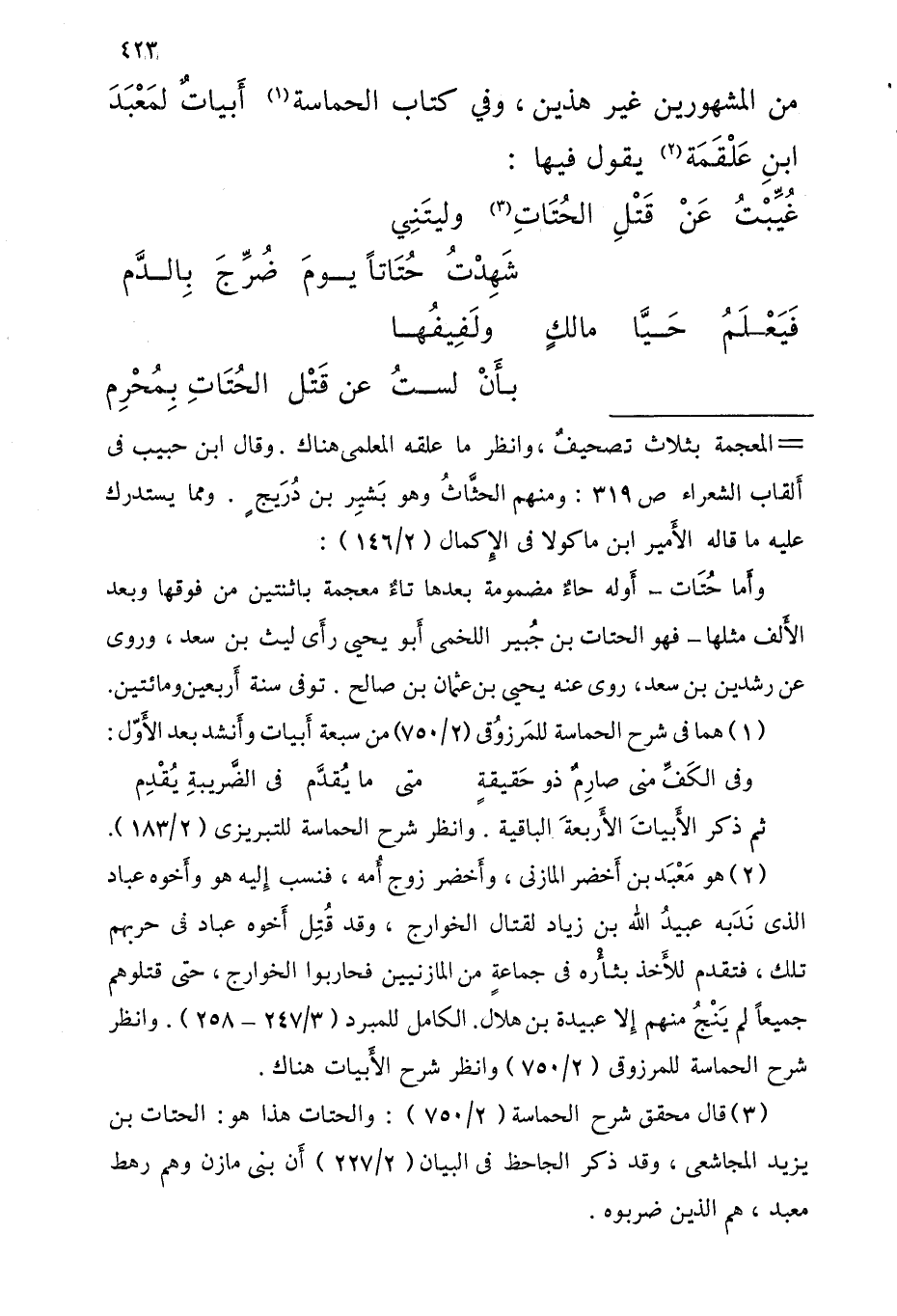 من الْمَشْهُورين غير هذَيْن وَفِي كتاب الحماسة أَبْيَات لمعبد ابْن علمقمة يَقُول فِيهَا