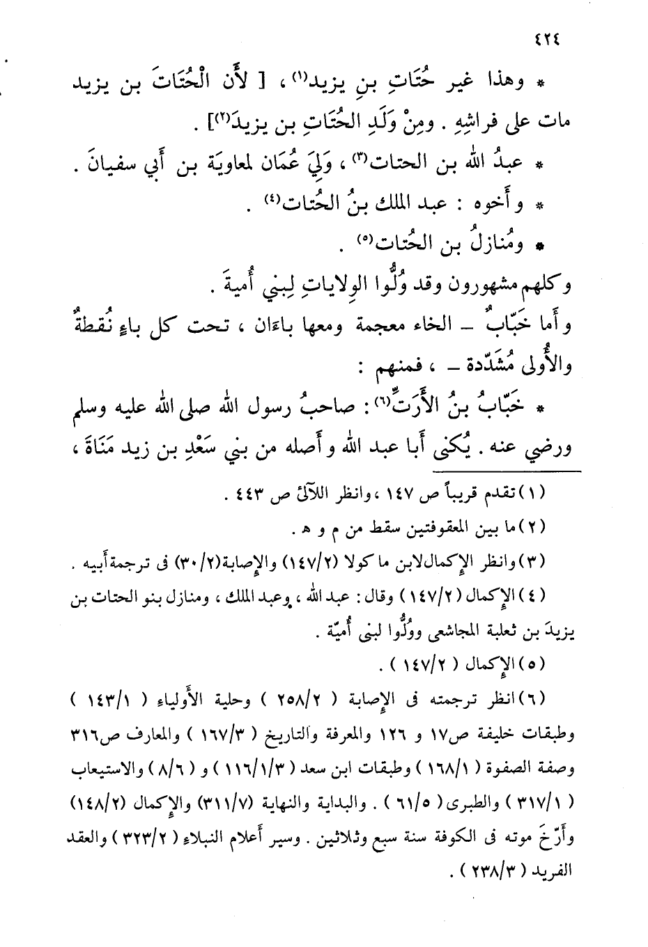 ومُنازلُ بْن الحُتات وَكلهمْ مَشْهُورُونَ وَقد وُلُّوا الوِلاياتِ لِبني أُميةَ وَأما خبابٌ الْخَاء مُعْجمَة وَمَعَهَا باءَان تَحت كل باءٍ نُقطةٌ وَالْأولَى مُشَدّدَة فَمنهمْ