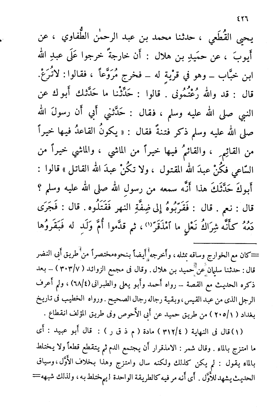 يَحْيَى الْقُطَعِيُّ حَدَّثَنَا مُحَمَّدُ بْنُ عَبْدِ الرَّحْمَنِ الطُّفَاوِيُّ عَنْ أَيُّوبَ عَنْ حُمَيْدِ بْنِ هِلالٍ أَنَّ خَارِجَةَ خَرَجُوا عَلَى عَبْدِ اللَّهِ ابْن خَبَّابٍ وَهُوَ فِي قَرْيَةٍ لَهُ فَخرج مروعا فَقَالُوا لاترع قَالَ قَدْ وَاللَّهِ رُعْتُمُونِي قَالُوا حَدِّثْنَا مَا حَدَّثَكَ أَبُوكَ عَنِ النَّبِيَّ صَلَّى اللَّهُ عَلَيْهِ وَسَلَّمَ ذكر فَقَالَ حَدَّثَنِي أَبِي أَنَّ رَسُولَ اللَّهِ صَلَّى اللَّهُ عَلَيْهِ وَسَلَّمَ ذَكَرَ فِتْنَةً فَقَالَ يَكُونُ الْقَاعِدُ فِيهَا خَيْرًا مِنَ الْقَائِمِ وَالْقَائِمُ فِيهَا خَيْرًا مِنَ الْمَاشِي وَالْمَاشِي خَيْرًا مِنَ السَّاعِي فَكُنْ عَبْدَ اللَّهِ الْمَقْتُولَ وَلا تَكُنْ عَبْدَ اللَّهِ الْقَاتِلَ قَالُوا أَبُوكَ حَدَّثَكَ هَذَا أَنَّهُ سَمِعَهُ مِنْ رَسُولِ اللَّهِ صَلَّى اللَّهُ عَلَيْهِ وَسَلَّمَ قَالَ نَعَمْ قَالَ فَقَرَّبُوهُ إِلَى ضِفَّةِ النَّهْرِ فَقَتَلُوهُ قَالَ فَجَرَى دَمُهُ كَأَنَّهُ شِرَاكُ نَعْلٍ مَا امْذَقَرَّ ثُمَّ قَدِمُوا أُمَّ وَلَدٍ لَهُ فَبَقَرُوهَا