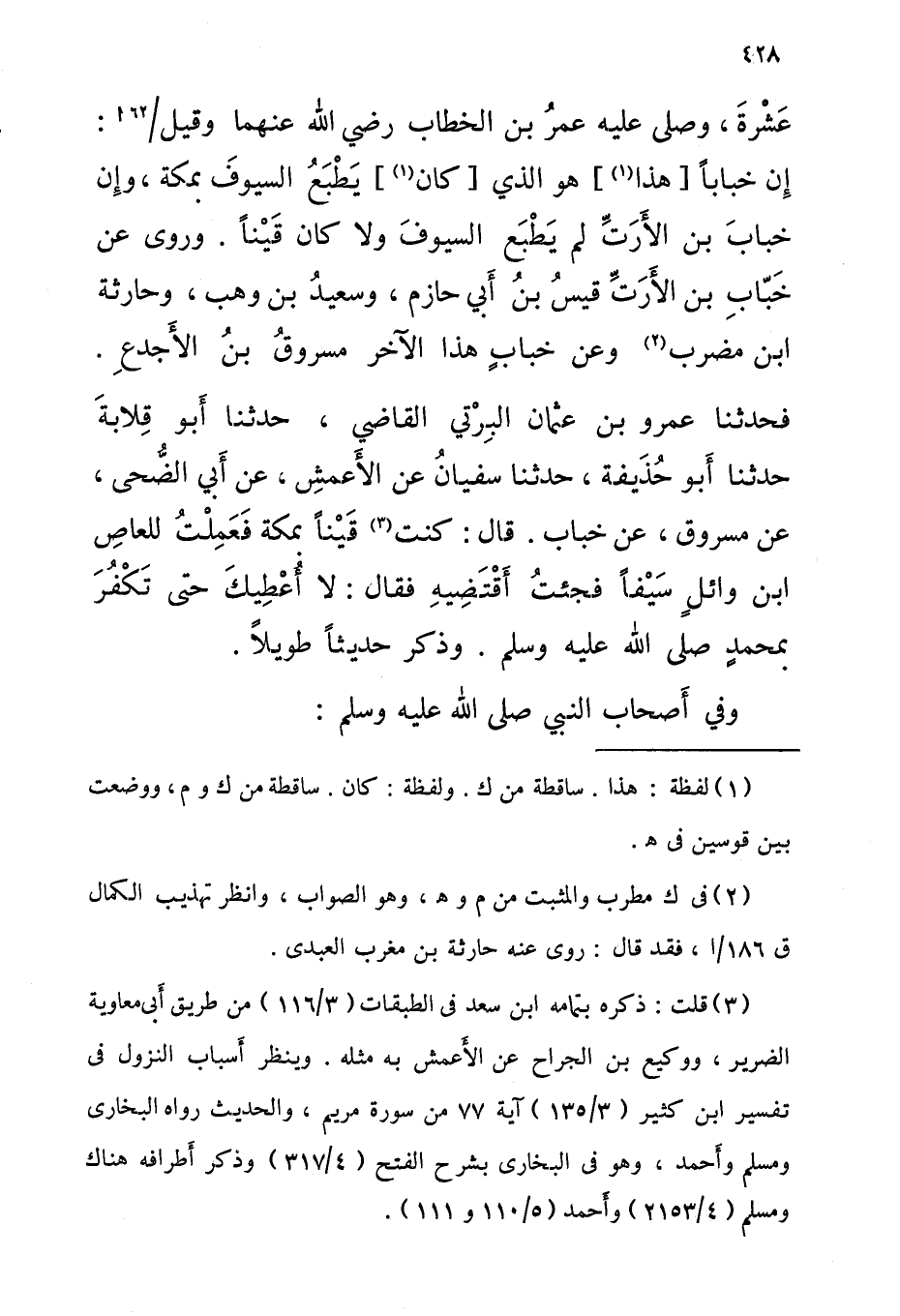 عشرَة وَصلى عَلَيْهِ عُمَر بْن الْخطاب رَضِيَ اللَّه عَنْهُمَا وَقيل 62 أإِن خبابًا [هَذا] هُوَ الَّذِي [كَانَ] يطبع السيوف بِمَكَّة وَإِن خباب بْن الْأَرَت لم يطبع السيوف وَلَا كَانَ قينا وروى عَن خباب بْن الْأَرَت قيسُ بْن أَبِي حَازِم وَسَعِيد بْن وهب وحارثة ابْن مضرب وَعَن خباب هَذَا الآخر مسروقُ بْن الأجدع فَحَدَّثَنَا عَمْرُو بْنُ عُثْمَانَ الْبِرْتِيُّ الْقَاضِي حَدَّثَنَا أَبُو قِلابَةَ حَدَّثَنَا أَبُو حُذَيْفَةَ حَدَّثَنَا سُفْيَانُ عَنِ الأَعْمَشِ عَنْ أَبِي الضُّحَى عَنْ مَسْرُوقٍ عَنْ خَبَّابٍ قَالَ كُنْتُ قَيْنًا بِمَكَّةَ فَعمِلت للعاص ابْن وَائِلٍ سَيْفًا فَجِئْتُ أَقْتَضِيهِ فَقَالَ لَا أُعْطِيكَ حَتَّى تَكْفُرَ بِمُحَمَّدٍ صَلَّى اللَّهُ عَلَيْهِ وَسَلَّمَ وَذكر حَدِيثا طَويلا