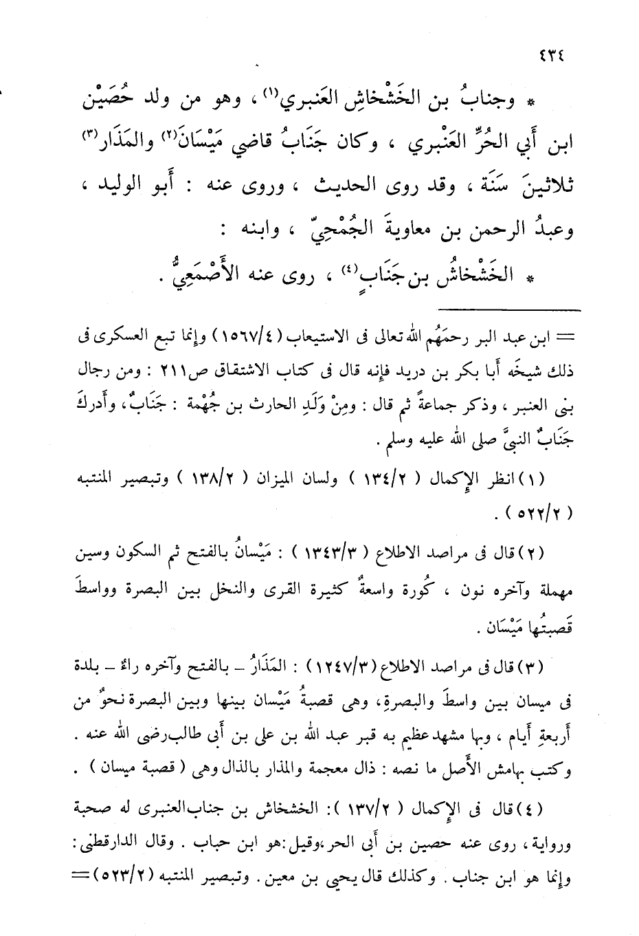 وجنابُ بْن الخشخاش الْعَنْبَري وَهُوَ من ولد حُصَيْن ابْن أَبِي الحُرَّ الْعَنْبَري وَكَانَ جَنَابُ قَاضِي مَيْسَانَ والمذار ثَلَاثِينَ سنة وَقد روى الحَدِيث وروى عَنْهُ أَبُو الْوَلِيد وعبدُ الرَّحْمَن بْن مُعَاوِيَة الجُمْحِيّ وَابْنه