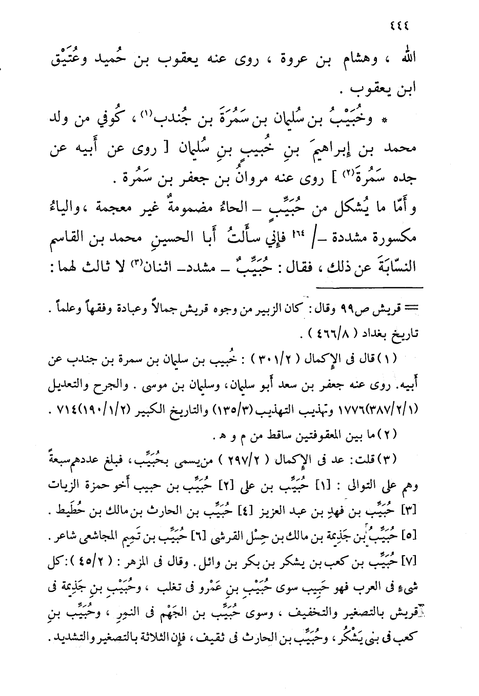 وخُبَيْبُ بْن سُلَيْمَان بْن سَمُرَة بْن جُنْدُب كُوفِي من ولد مُحَمَّد بْن إِبْرَاهِيم بْن خُبَيْبٍ بْن سُليمان [روى عَن أَبِيهِ عَن جَدّه سَمُرةَ] روى عَنْهُ مروانُ بْن جَعْفَر بْن سَمُرَة وأَمّا مَا يشكل من حُبَيِّبٍ الحاءُ مضمومةٌ غير مُعْجمَة وَالْيَاء مَكْسُورَة مُشَدّدَة 64 أفَإِنِّي سَأَلت أَبَا الْحُسَيْن مُحَمَّد بْن الْقَاسِم النسابة عَن ذَلِك فَقَالَ حُبَيِّبٌ مشدد اثْنَان لَا ثَالِث لَهما