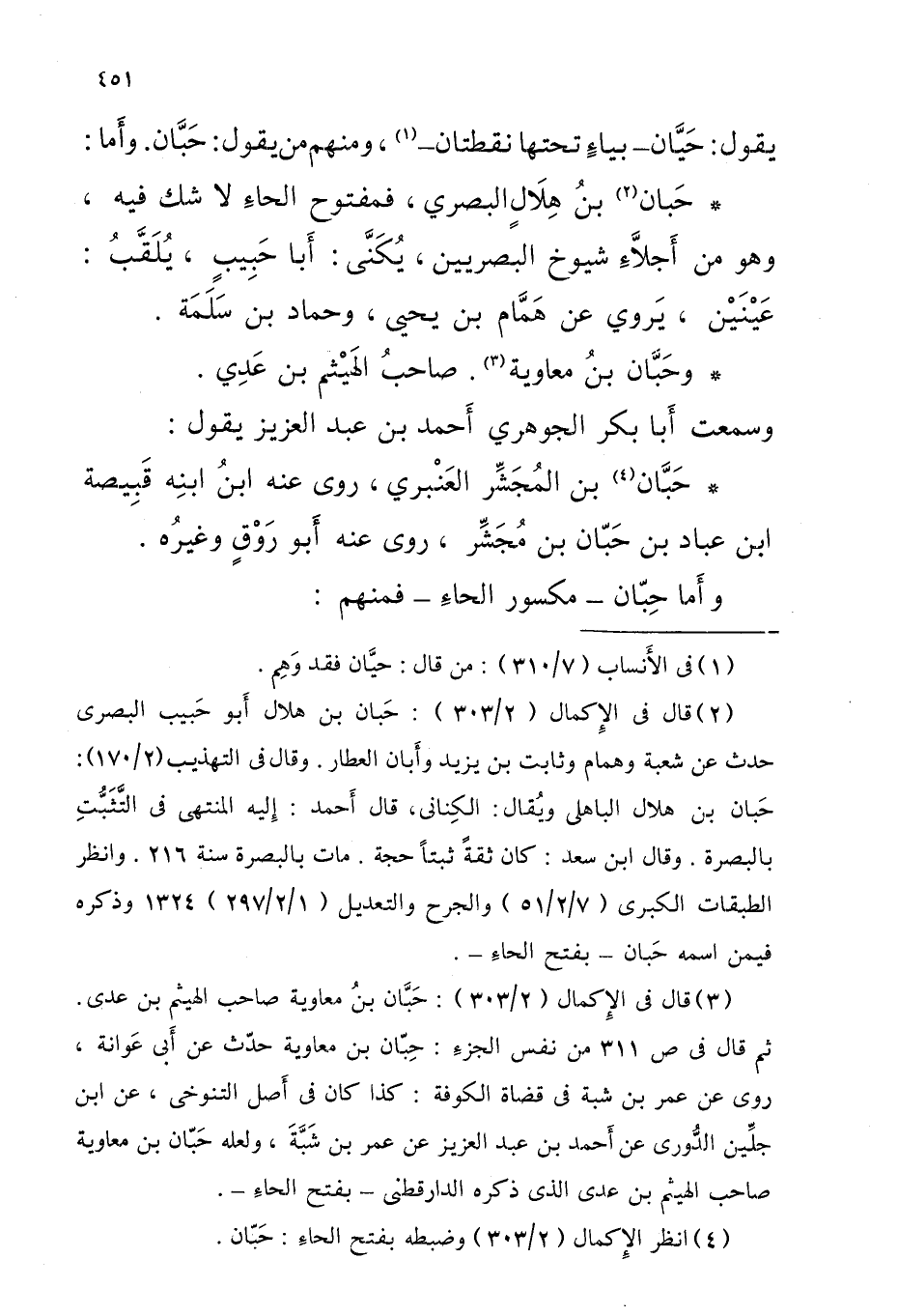 حِبَّان بْن هِلَالٍ الْبَصْرِيّ فمفتوح الحاءِ لَا شكّ فِيهِ وَهُوَ من أَجلَّاءِ شُيُوخ الْبَصرِيين يُكَنَّى أَبا حُبَيِّبٍ يُلَقَّبُ [عَيْنَيْن يَروي عَن هَمَّام بْن يحيى وَحَمَّاد بْن سَلَمَة