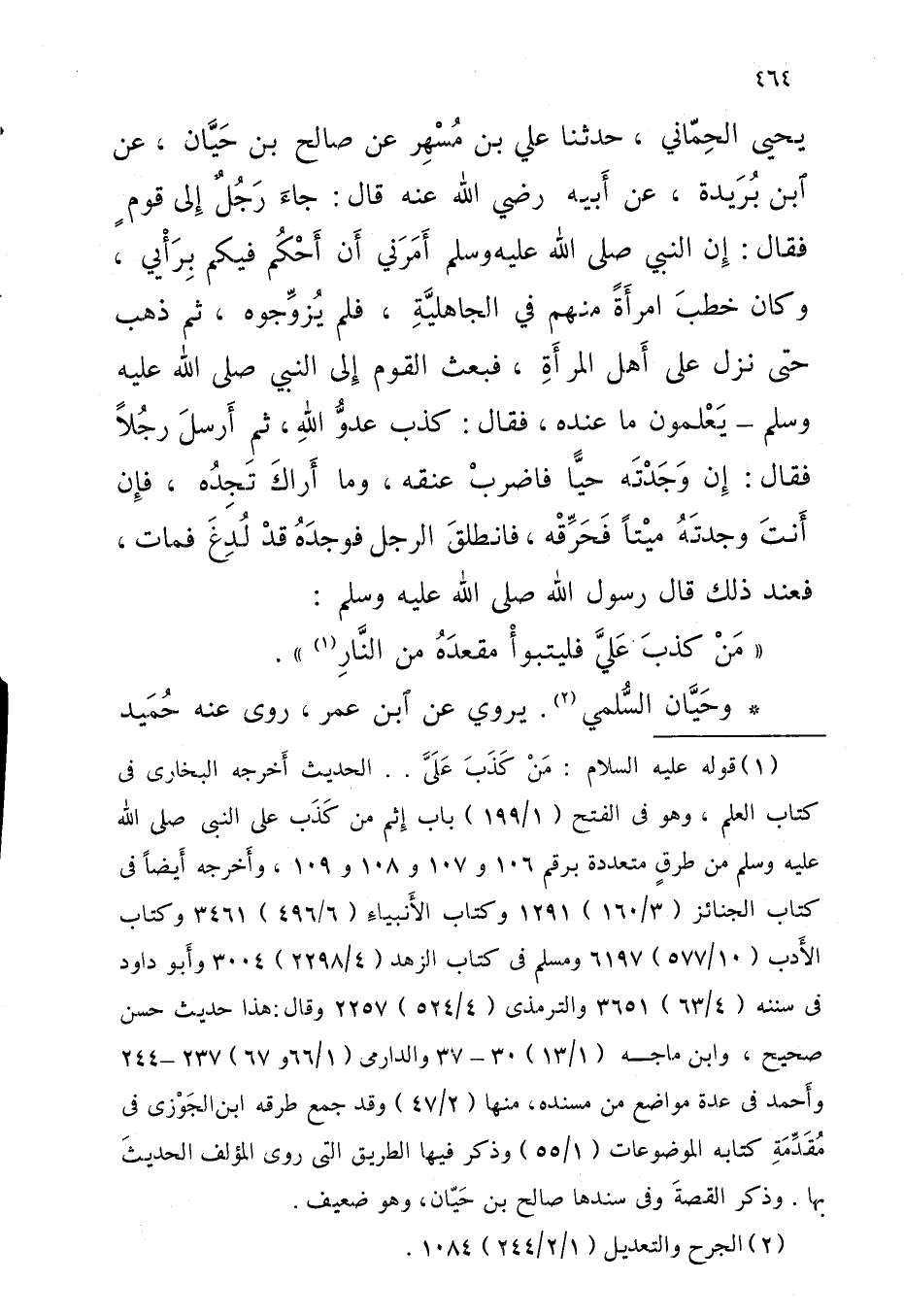 يَحْيَى الْحِمَّانِيُّ حَدَّثَنَا عَلِيُّ بْنُ مُسْهِرٍ عَنْ صَالِحِ بْنِ حَيَّانَ عَنِ ابْنِ بُرَيْدَةَ عَنْ أَبِيهِ رَضِيَ اللَّهُ عَنْهُ قَالَ جَاءَ رَجُلٌ إِلَى قَوْمٍ فَقَالَ إِنَّ النَّبِيَّ صَلَّى اللَّهُ عَلَيْهِ وَسَلَّمَ أَمَرَنِي أَنْ أَحْكُمَ فِيكُمْ بِرَأْيِي وَكَانَ خَطَبَ امْرَأَةً مِنْهُمْ فِي الْجَاهِلِيَّةِ فَلَمْ يُزَوِّجُوهُ ثُمَّ ذَهَبَ حَتَّى نَزَلَ عَلَى أَهْلِ الْمَرْأَةِ فَبَعَثَ الْقَوْمُ إِلَى النَّبِيِّ صَلَّى الله عَلَيْهِ وَسَلَّمَ يَعْلَمُونَ مَا عِنْدَهُ فَقَالَ كذب عَدو الله ثُمَّ أَرْسَلَ رَجُلًا فَقَالَ إِنْ وَجَدْتَهُ حَيًّا فَاضْرِبْ عُنُقَهُ وَمَا أَرَاك تَجدهُ فَإِن أَنْت وَجَدْتَهُ مَيْتًا فَحَرِّقْهُ فَانْطَلَقَ الرَّجُلُ فَوَجَدَهُ قَدْ لُدِغَ فَمَاتَ فَعِنْدَ ذَلِكَ قَالَ رَسُولُ اللَّهِ صَلَّى اللَّهُ عَلَيْهِ وَسَلَّمَ مَنْ كَذَبَ عَليّ فَليَتَبَوَّأ مقدعه مِنَ النَّارِ